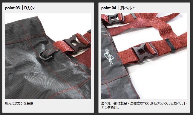 ベルトにはブラツキを抑える肩ベルトカンと軽量・高強度なYKKのLB-LVバックルを採用。