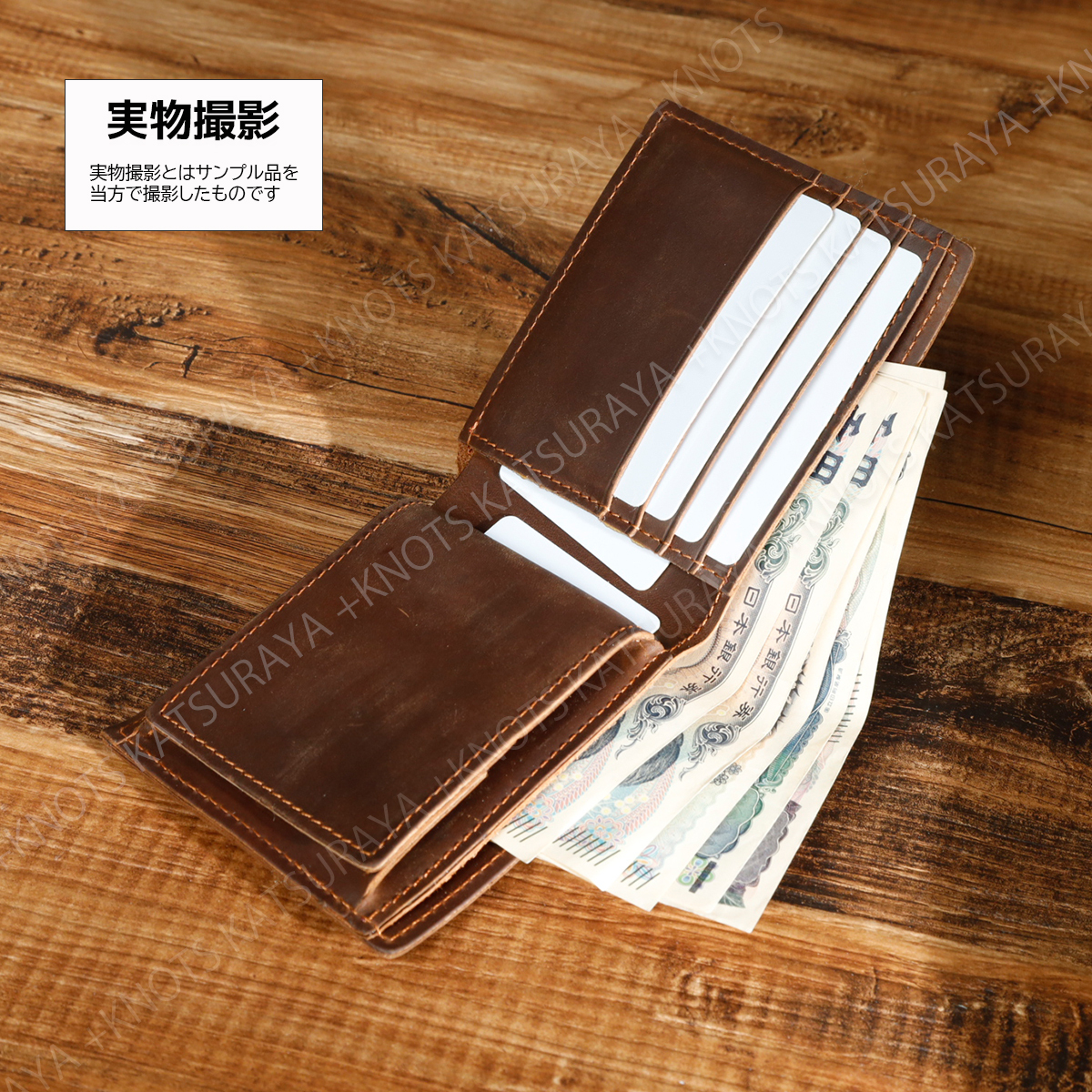 本革だけで作ったメンズ二つ折り財布です。内部にも表側と同じ本革を使用し裏地はありません。大きく開く大容量のBOX型コインケースを配置したことでで使い勝手が向上しました。牛革の表面をハブがけしオイルを染み込ませやすくする製法でしっとりとした質感が特徴の起毛革を採用しました。長くお使いいただくことで独特の経年変化(エイジング)お楽しみいただけます。素朴で使い勝手がよく幅広い年代の方にお勧めできる折り財布です。