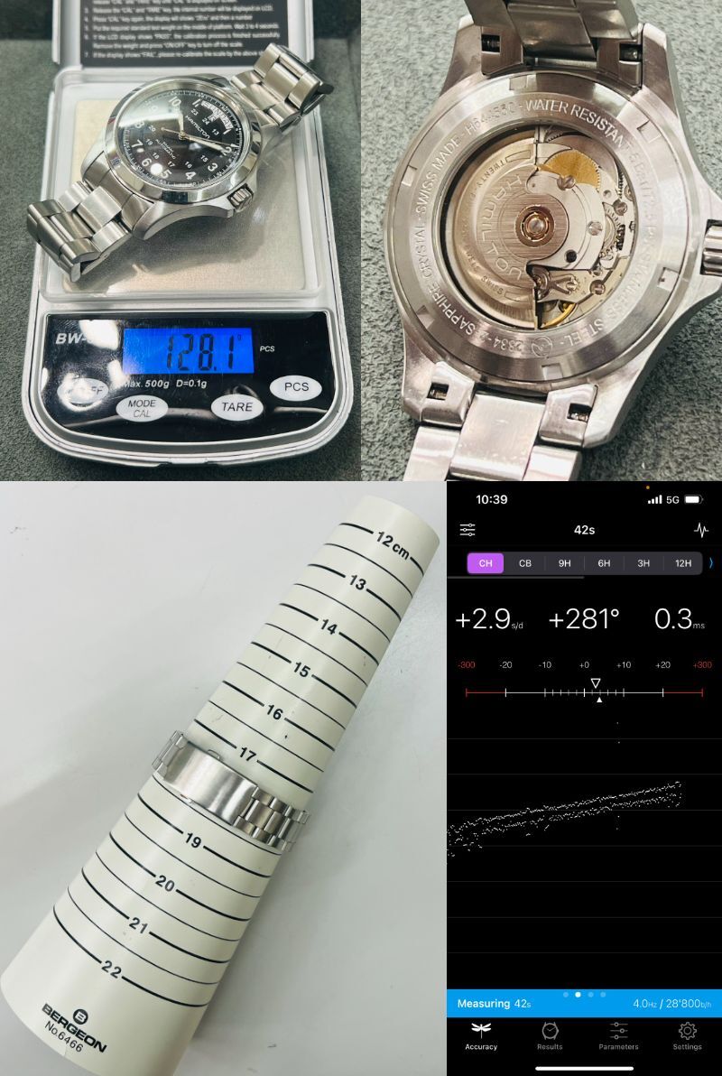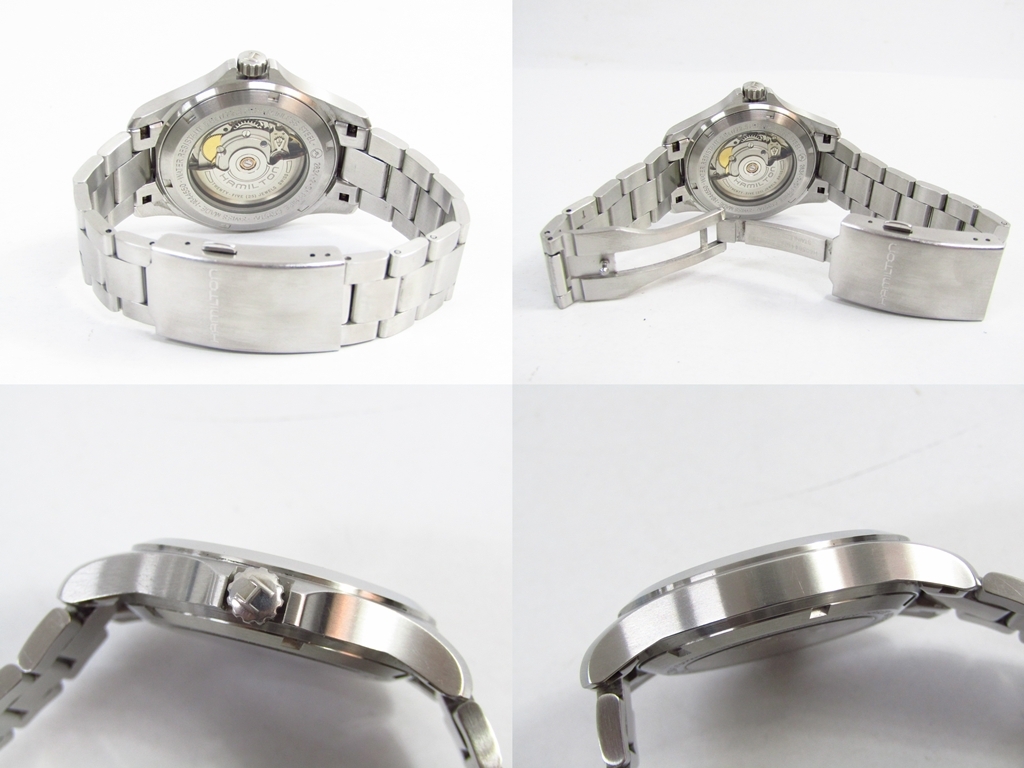 | ※こちらは一般のお客様から買取をした中古商品です。 【状態】 少々の使用感、少々擦り傷、ベゼルに小打痕などありますが、風防に傷は見受けられません。 動作・稼働品です。 箱にヤケがございます。 【詳細】 ブランド:ハミルトン/HAMILTON モデル名:カーキ キング 性別:メンズ ケース素材:SS ベルト素材:SS 文字盤色:ブラック 機械タイプ:自動巻き Ref.No:H644550 機能・特徴:デイデイト 付属品:時計、外箱、内箱、取扱説明書、余りコマ×2、ギャランティカード(店舗シールあり) ケースサイズ(w):約 40mm ベルトサイズ:約 19.5cm ラグ幅:20mm 振動数:21600 日差: +3秒/日 OH歴:弊社では実施しておりません。 | |||||||