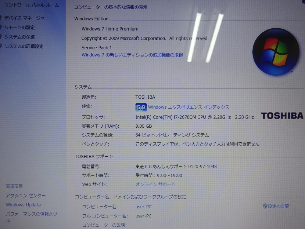 (Windows 7 Home Premium プロダクトキーは裏面に貼付してあります)