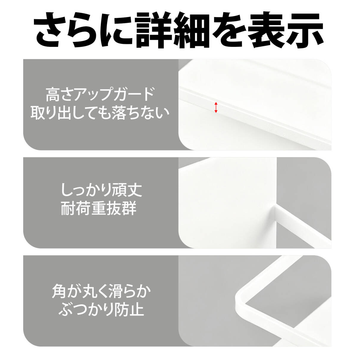 | この商品について | 【強力磁石で安定固定】:背面に大面積マグネットを採用。冷蔵庫やスチール面にしっかり吸着し、滑り落ちにくい設計。安心して調味料や日用品を収納できます。 【穴あけ不要・賃貸でも安心】:工具不要で簡単設置。壁を傷つけないので、賃貸住宅でも安心して使用可能。取り外し・再利用もラクラク。 【頑丈な鉄製素材&大容量】:高品質な鉄製で、変形しにくく長持ち。しっかりとした耐荷重力があり、スパイス瓶や調味料ボトル、洗剤ボトルもまとめて収納可能。 【安全なガード付きデザイン】:棚の前面には落下防止ガード付き。物が滑り落ちにくく、より安全に収納できます。 【幅広い用途で大活躍】:キッチンの調味料収納はもちろん、浴室でのシャンプーボトル、洗面所での洗剤や小物、ランドリー収納など、マルチに活用できます。 |