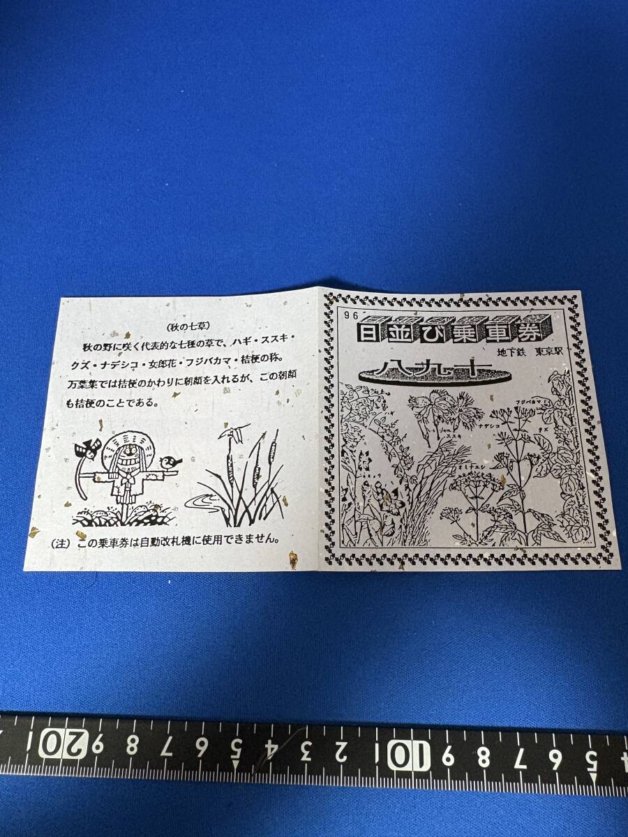 | 硬券 交通営団 日並び乗車券 96年 平成8年9月10日 八、九、十 地下鉄東京駅 記念乗車券 2種 台紙は薄い紫 秋の七草 の出品になります。 東京→160円区間 東京→180円区間 の2種になります 未使用品ですが、既に使用期限は経過しております。 コレクションとしてお使いください。 画像を確認の上ご入札をお願い致します。 |