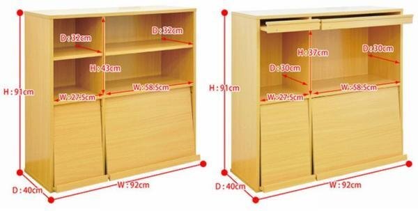 【カラー】 ナチュラル、ダークブラウン、ホワイト 【サイズ】 外寸:幅 92cm×奥行 40cm×高さ 91cm(1個あたり) (フラップなしタイプ) 内寸:[左]幅 27.5cm×奥行 32×高さ 43cm 内寸:[右]幅 58.5cm×奥行 32×高さ 43cm (フラップありタイプ) 内寸:[左]幅 27.5cm×奥行 30×高さ 37cm 内寸:[右]幅 58.5cm×奥行 30×高さ 37cm 【材質】 パーチクルボード、中密度繊維板(MDF)、プリント紙化粧合板 【生産国】 インドネシア 【梱包】 2梱包でお届けです。 サイズ (2-1):98.5×48×14.8cm (2-2):98.5×48×14.8cm 重量(合計):(約)45kg 【その他】 耐荷重:天板15kg、棚板5kg 【組み立て品】 お客様による組み立てが必要です。 |