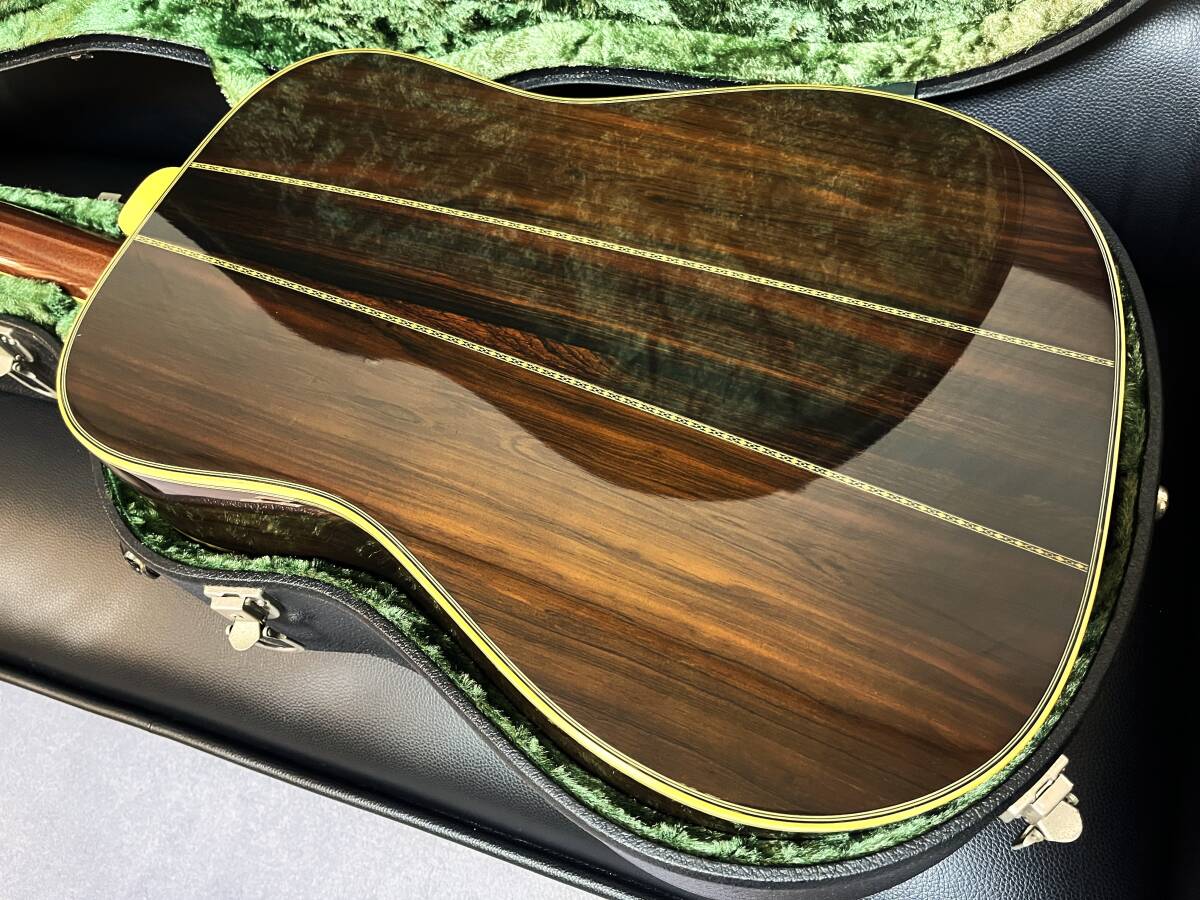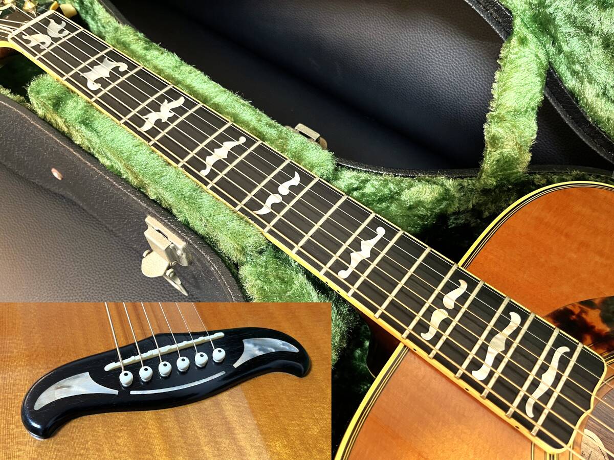 | YAMAHAヴィンテージのオリジナルウェスタンシリーズ最上位 N-1000 前期、の出品です。 出品に当たり、各部調整・給油、そしてビス1本に至るまで徹底的な磨き仕上げを施しました。 尚、当方出品のギターは全てフルオーバーホール、即ち、全部品を分解してチェック/クリーニング/再組立&調整を行い、初期性能状態にリカバリーする作業を実施しております。具体的には、電装系チェック(ピックアップ搭載機種のみ)、構成パーツの給油&清掃、ネック/フレットの調整、ボディの磨き上げ、組み立て後の最終チェック&調整を行い、1台1台丁寧に時間を掛け、機能/外観ともにベストな状態に仕上げ出品しております。 本機は1976年より販売開始されたNシリーズの最上級モデルで、材に拘った造りで未だ人気が高く、本オークションや一般市場でも滅多に出て来ない超希少品です。表板はスプルース単板、裏板(3ピース)とサイドには大変貴重なハカランダ材が採用されており、その低音から中音域にかけての歯切れの良さは抜群で、ストロークでもフィンガリングでもその材の乾き切った張りのある音色が冴えわたっています。また、デビュー当時の中島みゆきが愛用したことで知られる本モデルは、独特のヘッド形状やトラ目のピックガード、髭を形取ったブリッジなど、そのユニークなルックスが最大の特徴で、更に大胆なポシションマークがその存在感を大きく引き立てています。 1978年製の本機は稀に見る豪快なハカランダ模様を持つ個体で、前期型にしか見られない高コントラストの美しくゴージャスな杢目柄はまるで美術品の様です。更に、この世代によく見られる木部クラックや板割れも無く、外観&プレイアビリティともに程度の優れた美品の本モデルを今後入手することは極めて困難かと思いますので、YAMAHAヴィンテージファンの方々、中島みゆきファンの方々に自信を持ってお勧めいたします。 この度、ハードケースをお付けして出品致しますので、是非とも入札下さいます様御検討お願い致します。 |