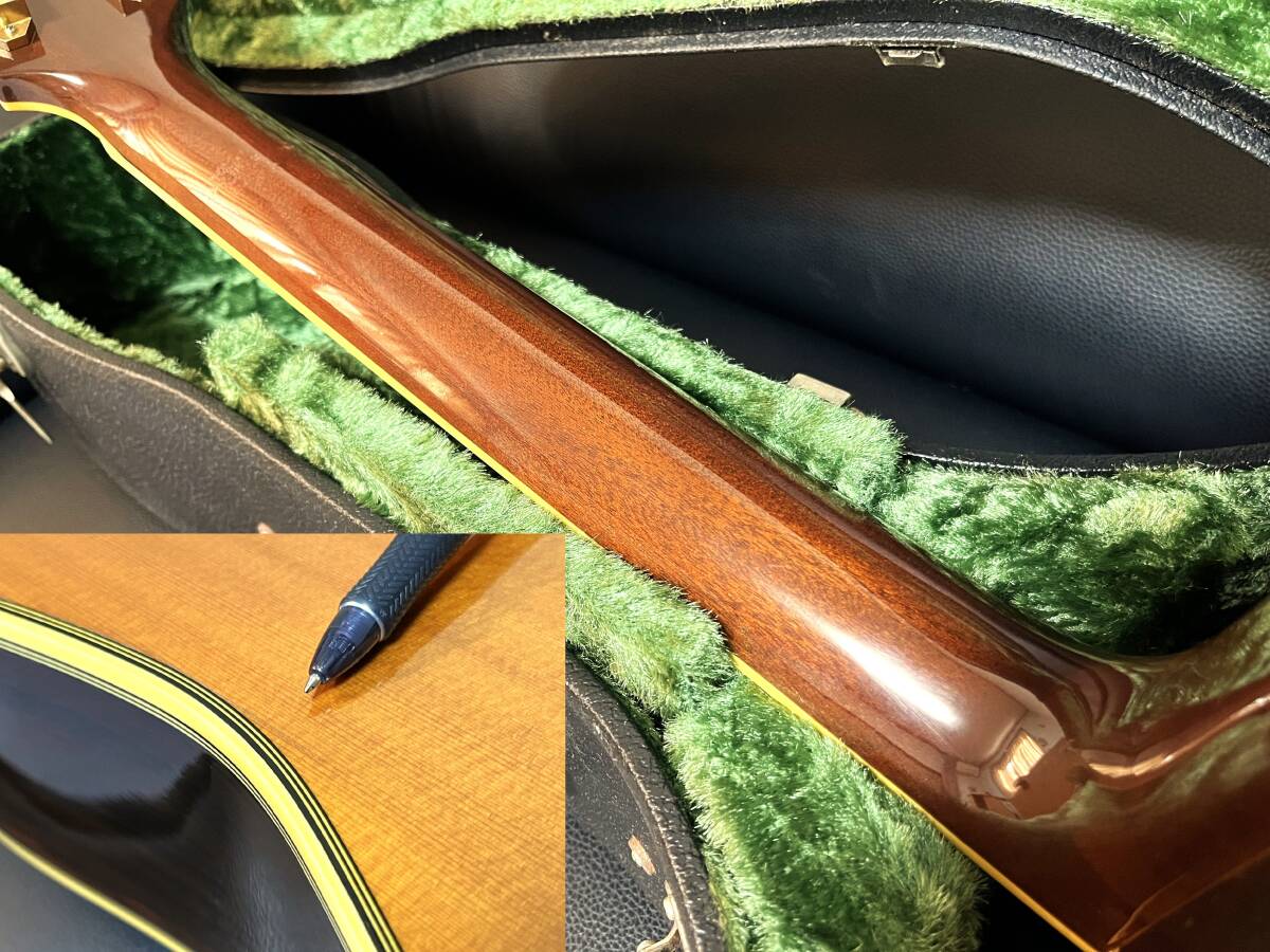 | ・・・2Fネック裏に旧式カポの浅い圧着痕がありますが、凹みや段差は無く演奏に支障はありません |