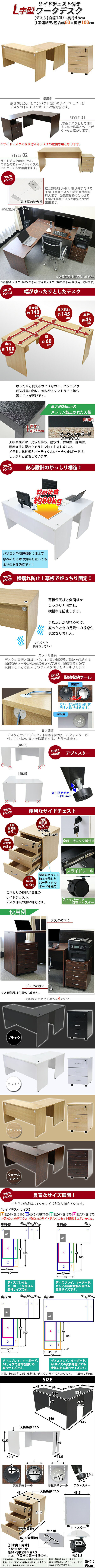 | 商品紹介 | ■作業スペースを広く確保出来る、L字型ワークデスクです。 ■サイドデスクの幅が約60cmのタイプです。 ■使いやすさ抜群の3段サイドチェスト付き。 ■引き出しは鍵を掛けると全段オールロック! ■会議室や事務所等、オフィス家具として様々なシーンでお使いいただけます。 ■天板には、メラミン加工を施しています。 ■幕板が天板と側面板をがっちりと固定!横揺れを防止します。 ■ネジ穴隠しのシール付き。(サイドデスクのみ付属) ■デスクの天板と幕板に配線収納ホールが2カ所ずつ備わっています。 ■アジャスターで高さの調節が可能です。(高さ調節範囲〜約15mm) ※こちらの商品は、組立て式です。組立てにはプラスドライバーが必要です。お客様でご用意ください。 ※組立図が付属します。 ※サイドデスクの取り付けはデスクの左側専用となります。 ■材質:パーティクル(パーチクル)ボード(メラミン加工)(本体、サイドデスク、サイドチェスト)、プラスチック(アジャスター、配線収納ホール、キャスター)、カークサイト(亜鉛合金)(取っ手、鍵)、スチール(スライドレール) ■重量:L字型デスク:約45kg (デスク:約24kg、サイドデスク:約21kg) サイドチェスト:約20kg ■L字型デスク総耐荷重:約80kg ■サイドチェスト耐荷重:約20kg(天板(引き出しに何も入っていない時))、約3kg(各引き出し) ■付属品:鍵2個(内スペアキー1個)、組立図 ●新品商品ではありますが、輸入商品の為、多少の擦り傷などがある場合がございますので、ご納得の上ご購入下さいませ。 ●ご購入後、お客様ご都合によるご返品、ご返金等は一切お受け致しておりません。 ●本商品を使用した際に発生したトラブル、事故につきまして、当社は一切の責任を負いません。ご使用に関しましては、全て自己責任にてお願い致します。 ※カラーはナチュラルとなります。 |