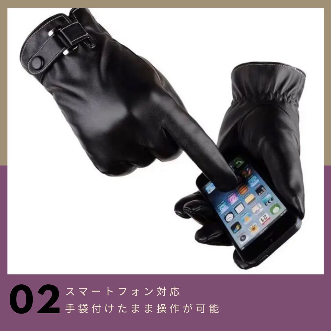 【スマホ対応・革手袋】商品情報サイズ全長23cm手囲い 22cm中指  9cm重量両手合わせて90g生地裏起毛性能撥水スマートフォン対応この冬、春大活躍のアイテム一度付けたらやめられない!【カラー】商品画像1枚目、タイトルをご確認ください。【合成皮革、全指タッチ操作対応手袋】合成皮革で高級感漂う男性用グローブで大人気の商品です。男性用手袋全てのスマホ、タブレット、カーナビ、ATMなどのタッチパネルに高感度対応しております。(全指タッチパネル対応の優れものです)PUレザー製なので高級感があり、水にも強くお手入れは簡単です。内側は毛布のような肌触りで気持ちよく、そして暖かい仕様となっております。【あらゆる場面で活躍】シンプルで落ち着いたデザインなので、日常・ビジネスシーンどちらでもご使用いただけます。また雨にも強いので自転車やバイクの運転時にも重宝します。イルミネーション 旅行 外出 アウトドア 山登り 釣り だけでなく車の運転にもおすすめです。通気性・保湿性にもこだわった男性専用手袋です。スマートフォン(アイフォンやアンドロイド)に対応しておりますので大変便利です。バイクに乗る方や、スーツなどの正装にもバッチリ合います。【注意事項】・送料の都合上箱なし、簡易包装での発送となります。・海外製品の為、多少の傷や汚れ等ある場合がございます。関連ワードバイク 自転車 サイクリング スポーツ スキー ランニング ジョギング ウォーキング 登山 ハイキングキャンプ ピクニック アウトドア 旅行 通勤 通学 室外作業 お釣り 防寒対策 メンズ レディース プレゼントギフト クリスマス 誕生日 記念日 お歳暮