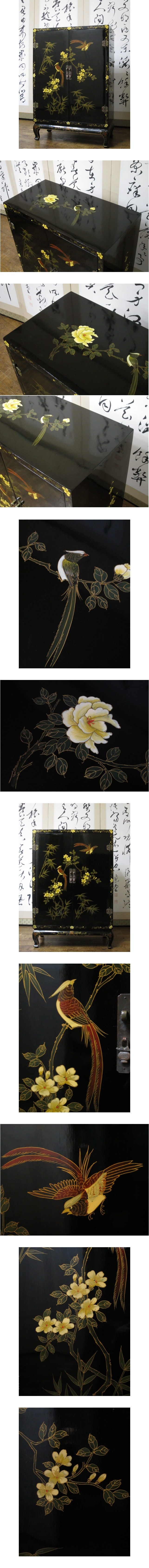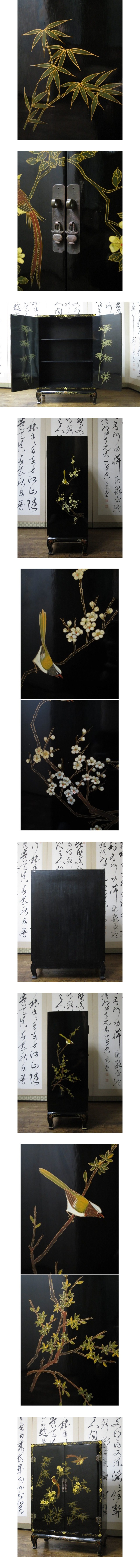 漆黒の美しい色艶に華やかな花鳥の図柄が印象的な中国美術の飾り棚の出品です。全体の構図も目が引き、手間隙かけて造られたことが伺え、色合いも美しく華やかで造りの良さを感じさせます。とても手の込んだ存在感ある見事な逸品です。お部屋のアクセントにいかがですか・・・その他、ご使用に問題のある大きなダメージ等は御座いませんが、あくまでも古い物となりますので、古い物にご理解頂ける方のみご入札下さいますよう宜しくお願い致します。