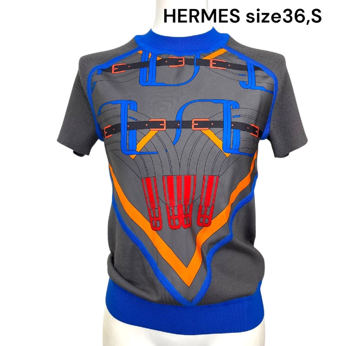 ●美品 エルメス HERMES ベルト柄 シルク、ニット ドッキング カットソー トップス 36、S レディース S5Q790