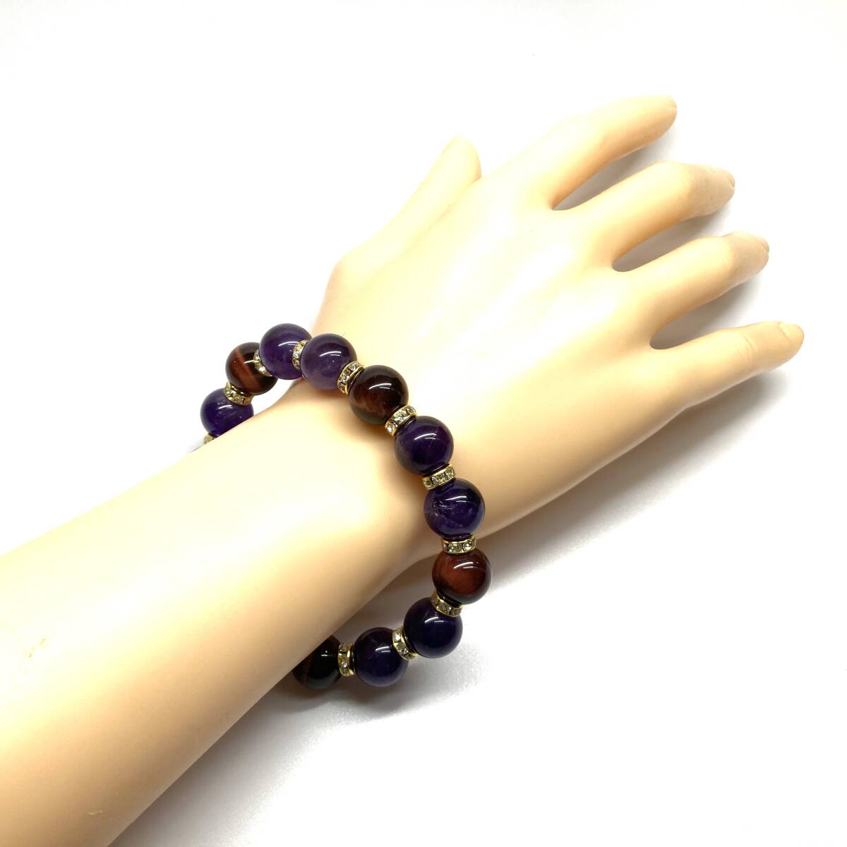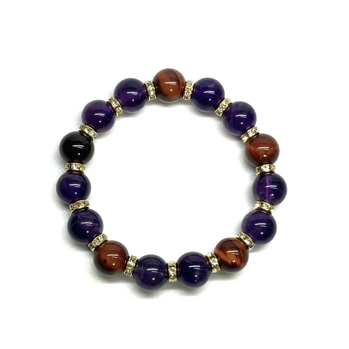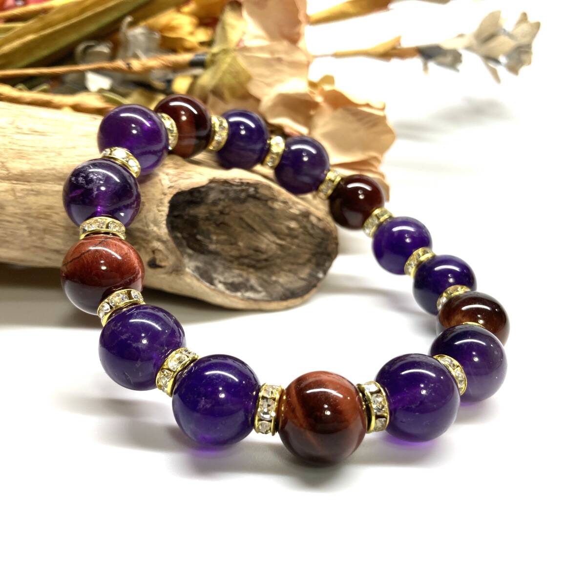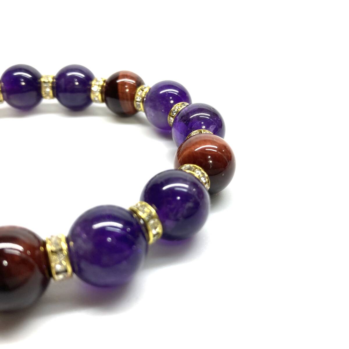 こちらは、レッドタイガーアイとアメジストを組み合わせたパワーストーンブレスレットです。間にはロンデルを挟み高級感あるデザインに仕上げております。石大きさは12mm玉を使用して内周約18cmです。気になる方は是非この機会にどうぞ。