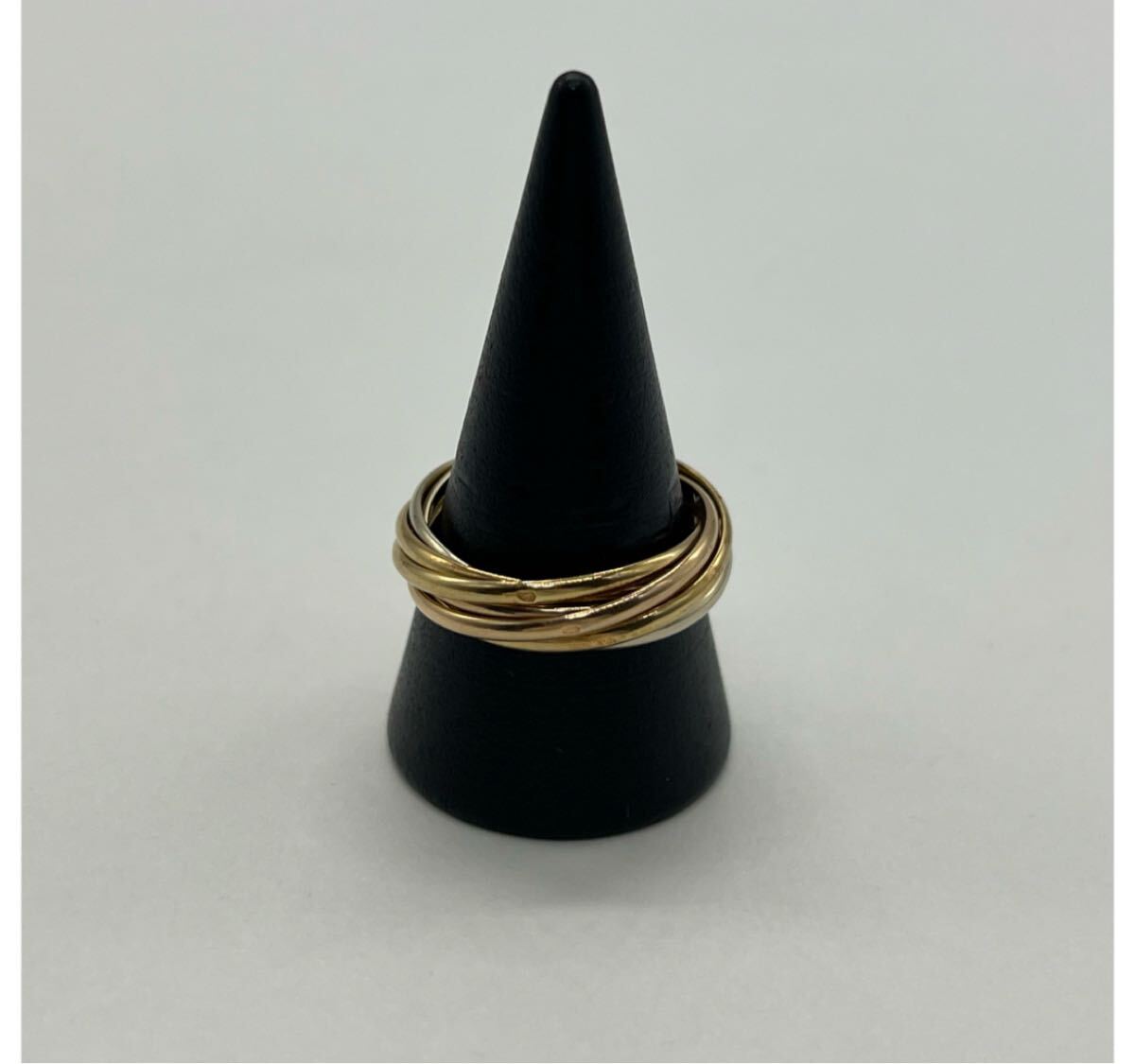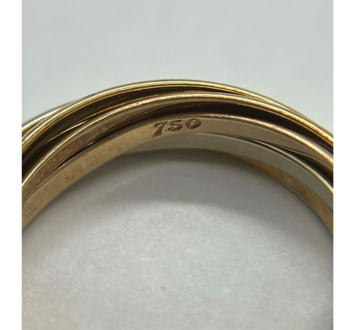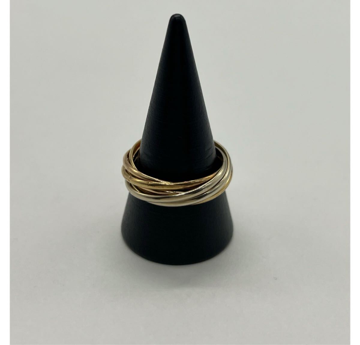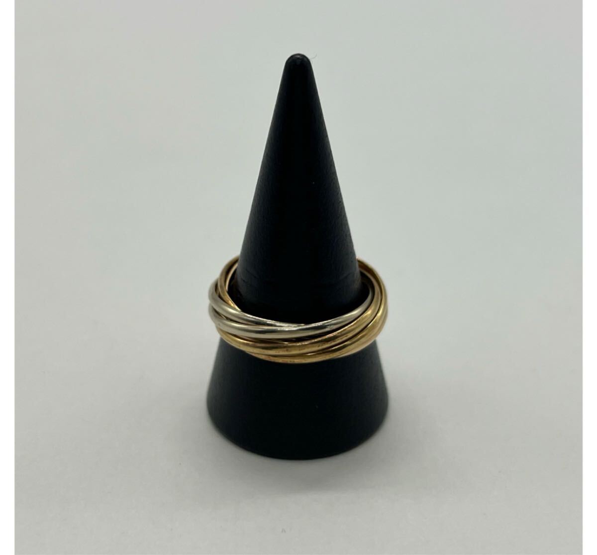 伝統的な3連のデザインを超えて7つのリングが交差し絡み合う構造になっており、それぞれのリングが絶妙なバランスで繋がり、複雑でありながらも優美なデザインは、着用時に上品な印象を与えてくれるお品物でございます。