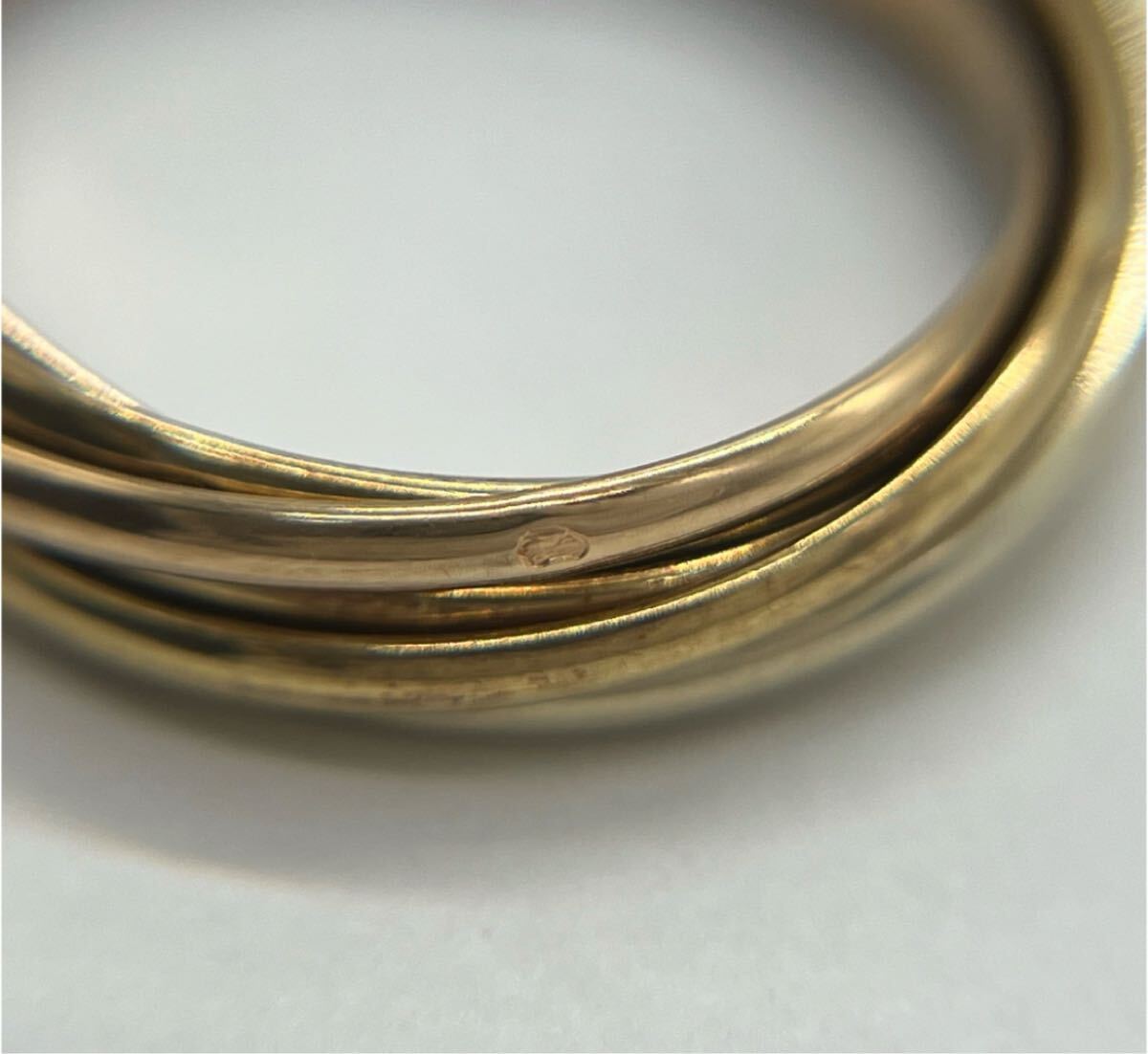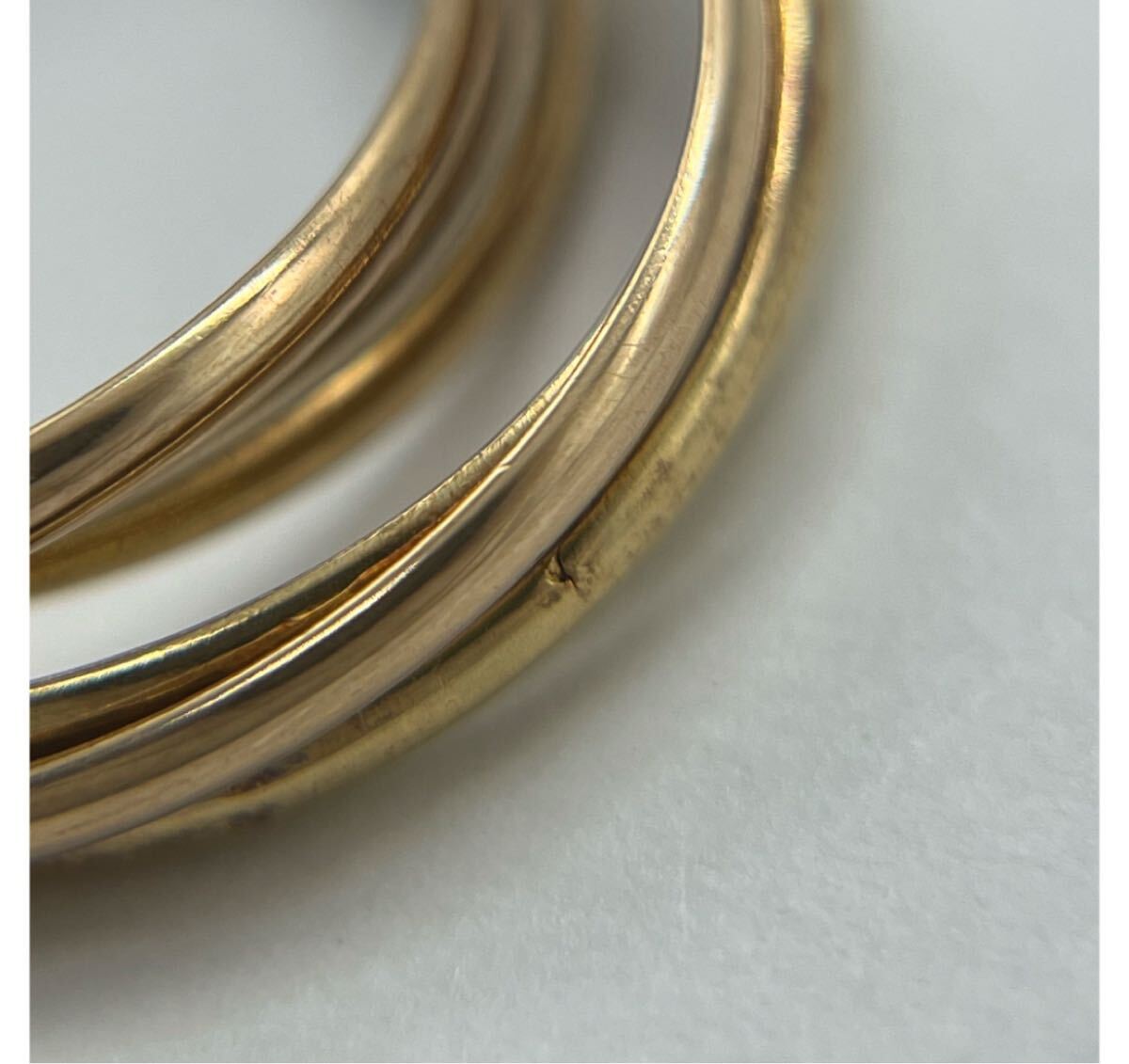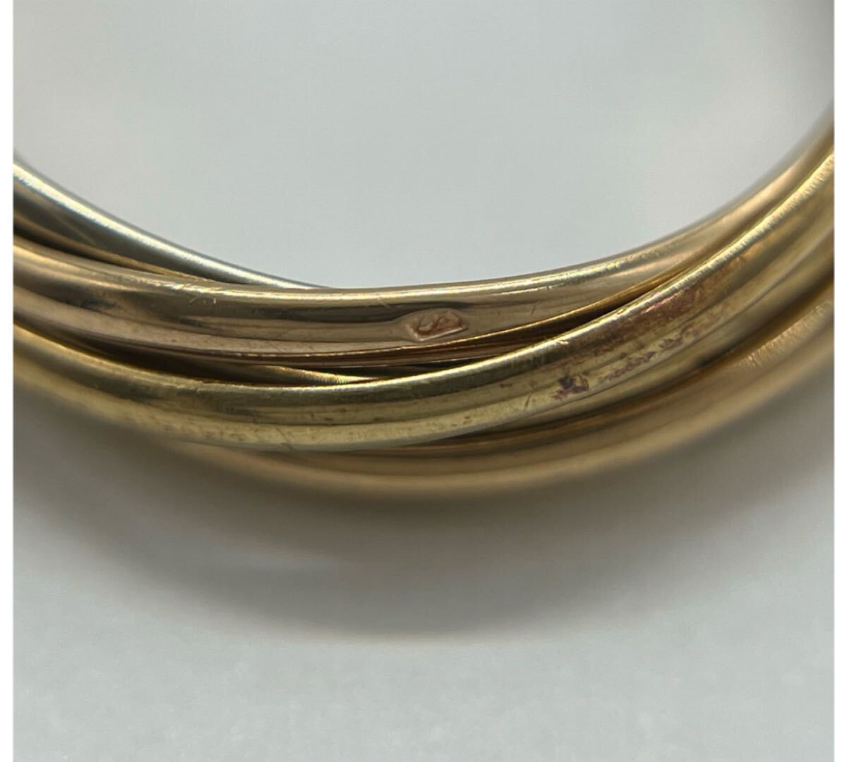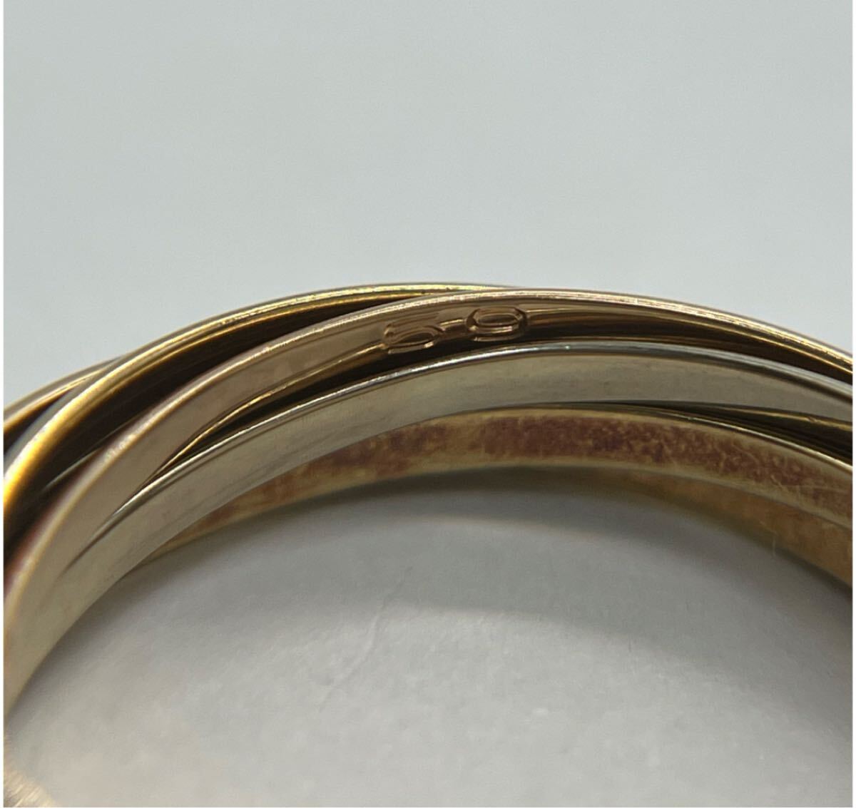 伝統的な3連のデザインを超えて7つのリングが交差し絡み合う構造になっており、それぞれのリングが絶妙なバランスで繋がり、複雑でありながらも優美なデザインは、着用時に上品な印象を与えてくれるお品物でございます。