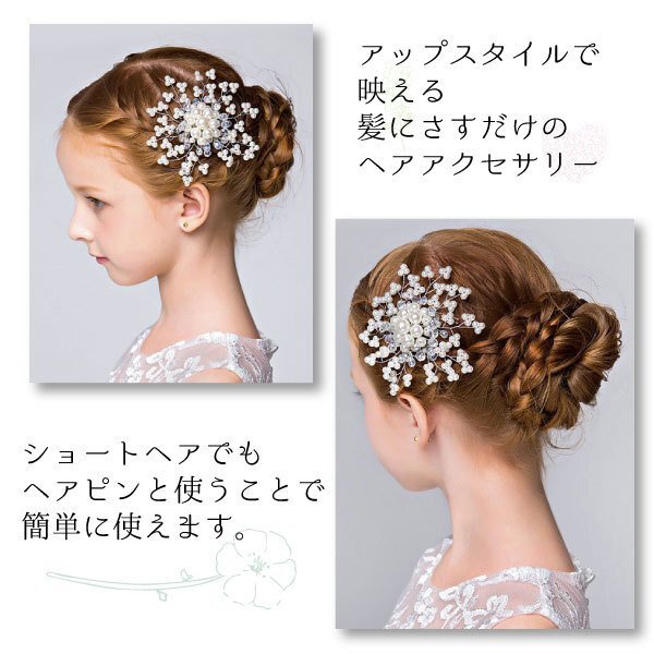 | ☆ヘアコーム キッズ パールの髪飾り 【商品名】 ヘアーコーム 【素材】 合金等 【サイズ】 約10cmx約10cm *伸び縮みするので変化します。 【重さ】 約24g 【使用方法&使用上の注意事項】 髪の毛にさすだけで簡単にコーディネイトにプラスワン♪ ドレスアップにワンポイントを加え、煌びやかにヘアースタイルを彩ります。 アップスタイルだけでなくポニーテールの結び目の位置にさりげなくつけてみたり、ショートヘアーにも♪ ショートヘアーやショートボブにはヘアピン(別売り)をお使いください。 短めの髪型でも気軽にヘアーコームが楽しめます。 ピアノの発表会や卒園式、様々な発表会やお遊戯会。パーティーなどでお使いください。 伸縮する素材ですのでセットする際は形を整え、ご使用ください。 水分、油分に弱い素材です。ご使用後は柔らかい布などでふき取るなどし保管ください。 【保障について】 この商品にはメーカー保証がございません。 初期不良の場合のみ、商品到着から1週間以内であれば弊社で対応いたしますので、ご連絡ください。 | ||||