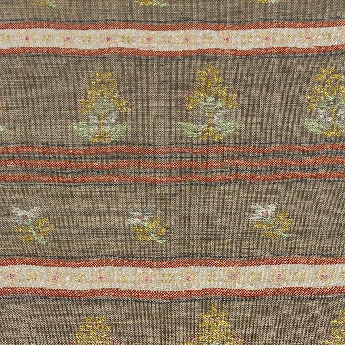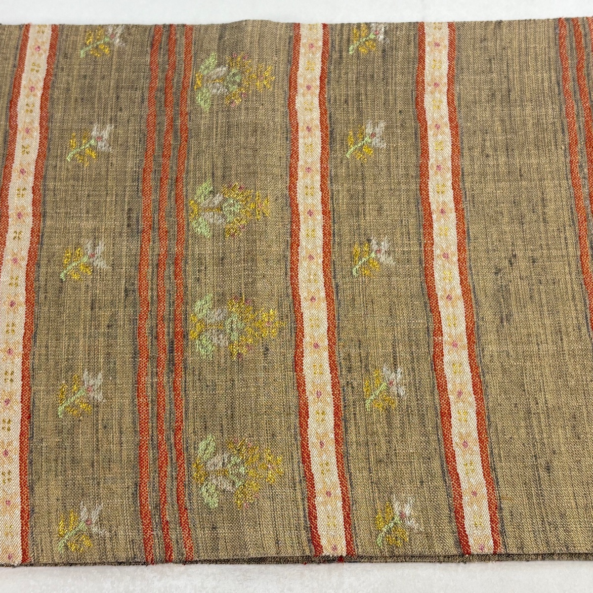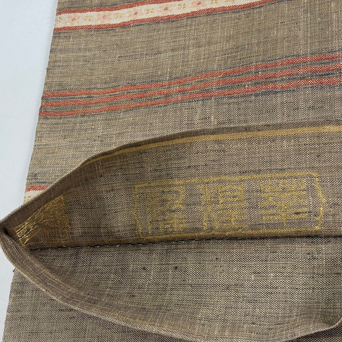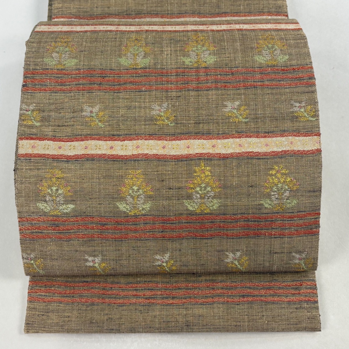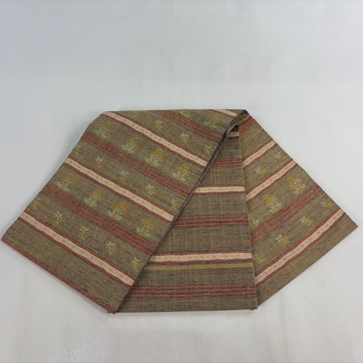 | 袋帯 美品 逸品 落款 草花 段縞 金通し 箔 薄茶色 お太鼓柄 正絹 【中古】 |