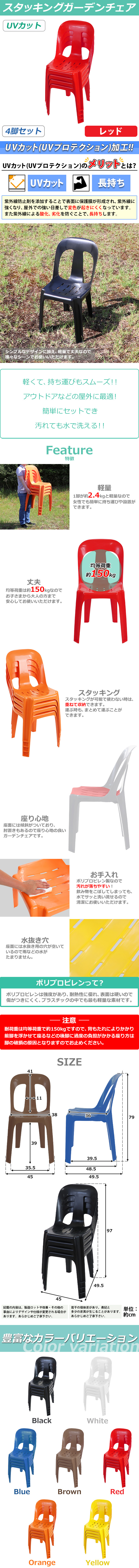 ●UVカット加工によって屋外での強い日差しで変色しにくくなっています。 ●紫外線による酸化、劣化を防ぐことにより、長持ちする作りになっています。 ●スタッキング構造なので重ねる事が可能なので、収納やまとめて運ぶ際にも大変便利です。 ●座面には水抜き穴が空いているので雨などの水がたまりません。 ●本体重量は約2.4kgと軽量タイプなので、女性でも軽々持ち運べます。 ●材質は、軽量、安全、防水のポリプロピレン(PP)です。 ●完成品なので届いたらすぐにお使いいただけます。 注意! 背もたれによりかかり前脚を浮かせて座るなどの後脚に過度の負担がかかる座り方は脚の破損の原因となりますのでお止めください。 ■重量:約2.4kg(1脚あたり) ■均等荷重:約150kg ■材質:PP[ポリプロピレン](本体) ●商品のカラーはレッドとなります。 ●新品商品ではありますが、輸入商品の為、多少の擦り傷などがある場合がございますので、ご納得の上ご購入下さいませ。 ●ご購入後、お客様ご都合によるご返品、ご返金等は一切お受け致しておりません。 ●本商品を使用した際に発生したトラブル、事故につきまして、当社は一切の責任を負いません。ご使用に関しましては、全て自己責任にてお願い致します。 |