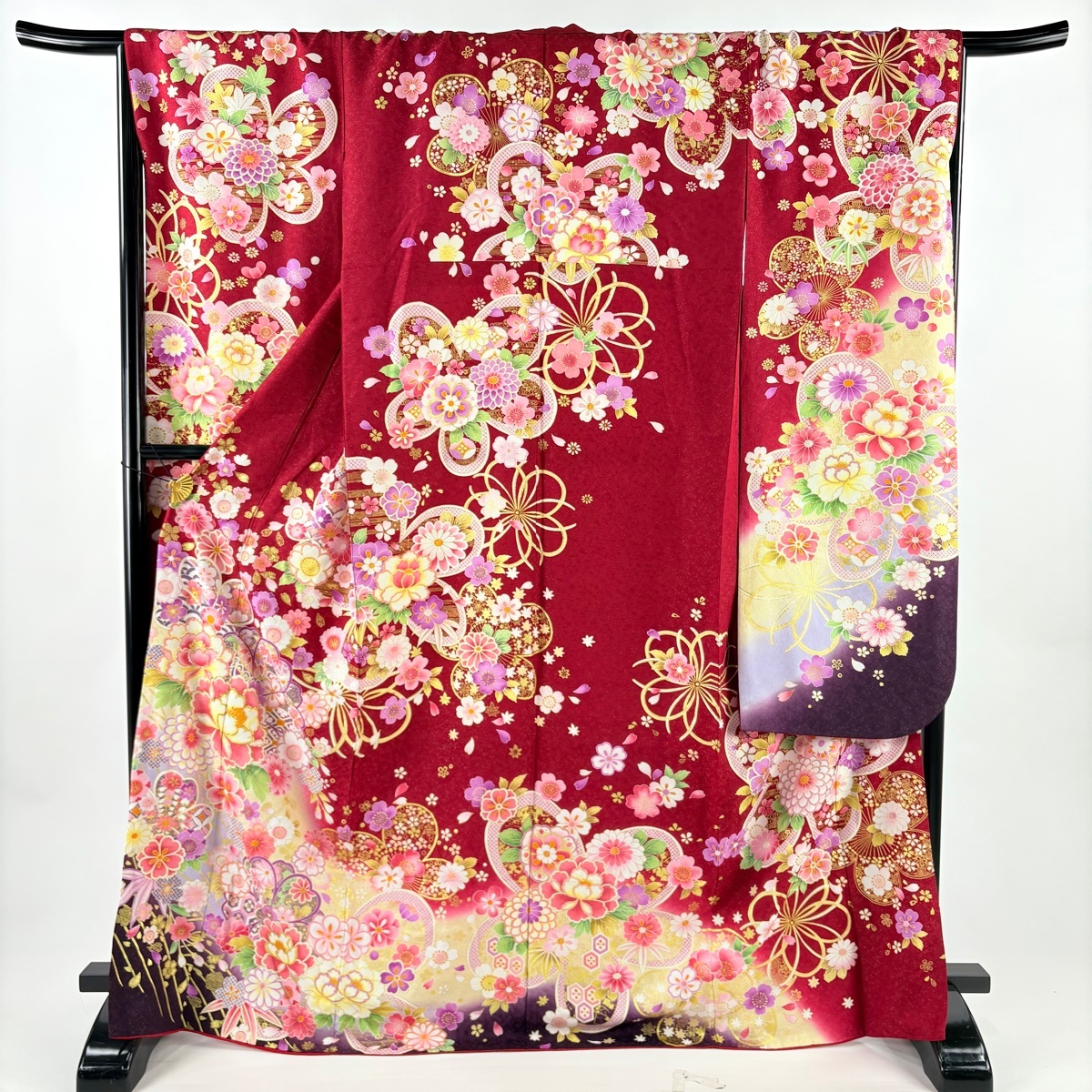 | 振袖 美品 名品 牡丹 桜 箔 銀通し 赤 袷 身丈168.5 裄丈68 L 正絹 【中古】 |