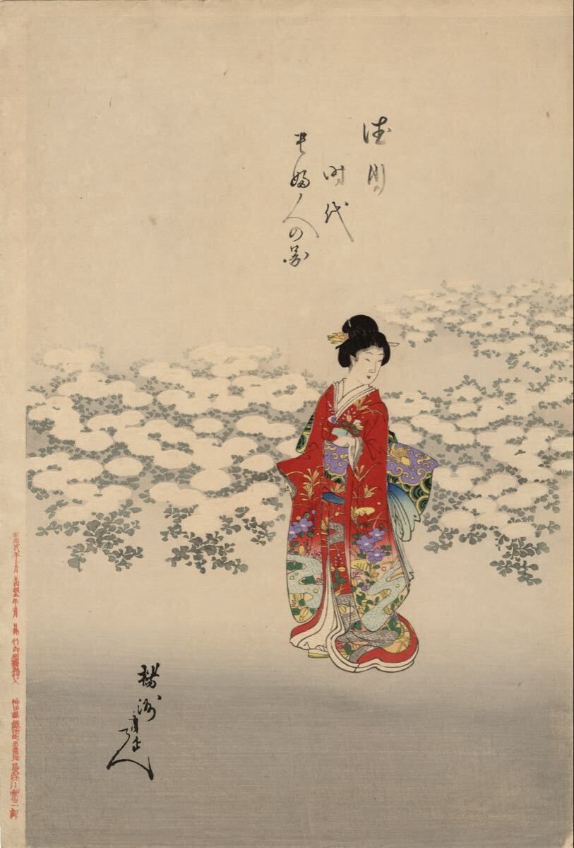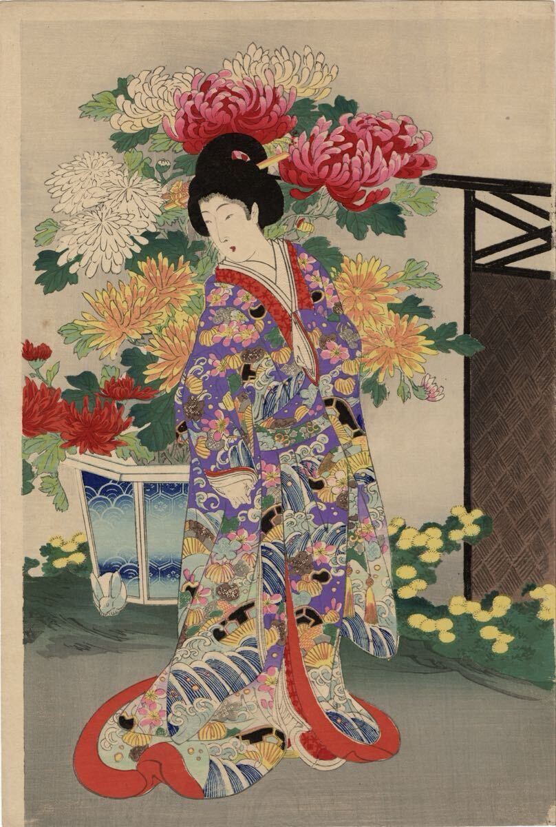 〇商品説明〇 明治28年 1895刊行 楊洲周延筆 「徳川時代貴婦人の図・観菊」です。 寸法:約25cm x37cm x3枚 状態良好です。 状態は画像にてご確認ください。