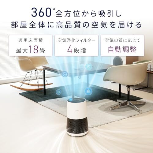 【空気の状態に合わせて自動調整】 センサーが室内の空気の質を常にモニターし、LEDランプ(赤・黄・青)でリアルタイムに表示します。空気の汚れ具合に応じてファン速度を自動で調整するため、常に快適な空気環境を保てます。