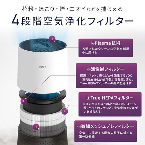 【4段階のフィルターで空気を徹底的に浄化】 微細なホコリを捕らえる微細メッシュプレフィルターから、花粉やPM2.5を除去するTrue HEPAフィルター、気になるニオイを吸着する活性炭フィルター、さらにウイルスや細菌を抑制し、空気中の不純物を効果的に取り除きます。※空気の浄化とは、無生物の粒子を除去することを意味します。