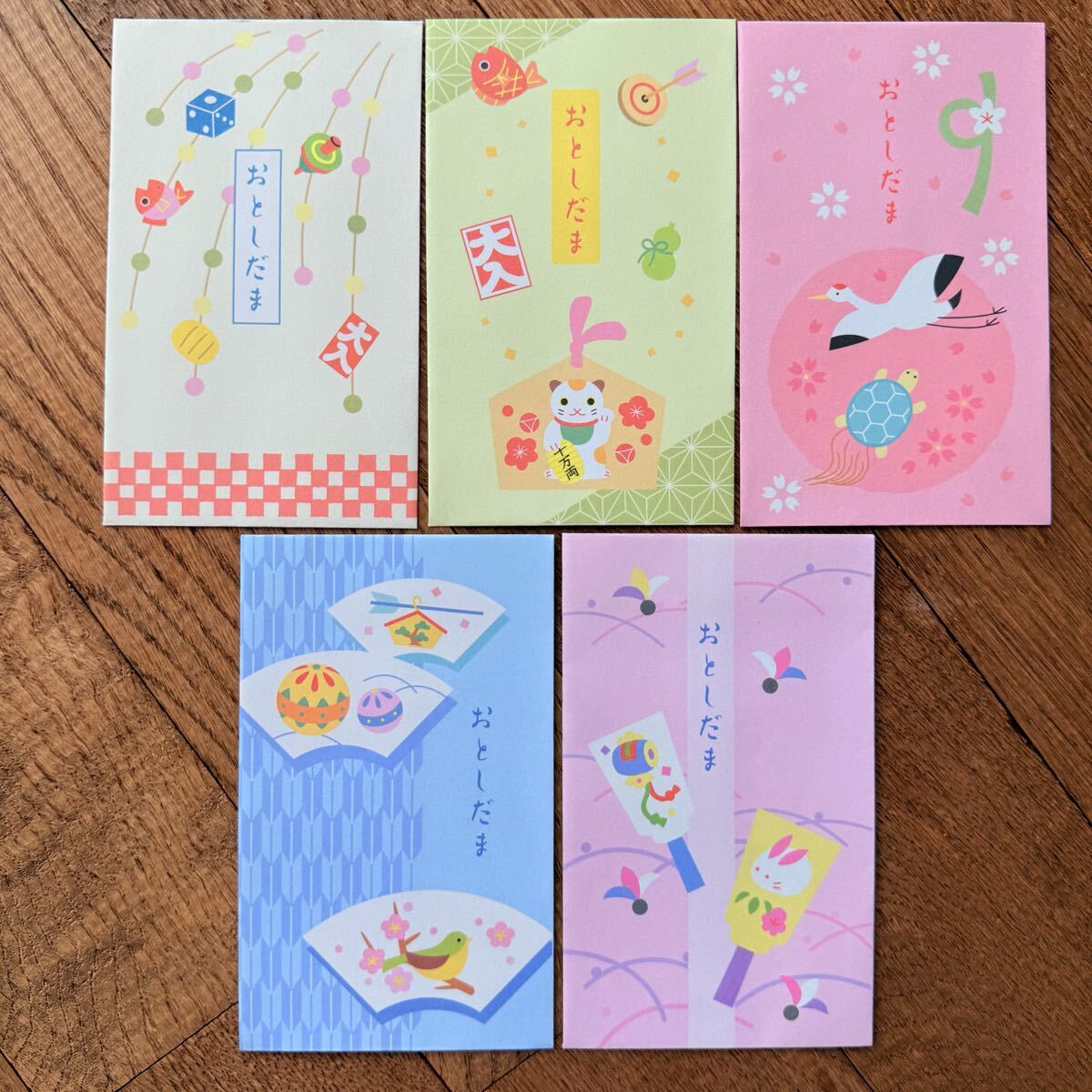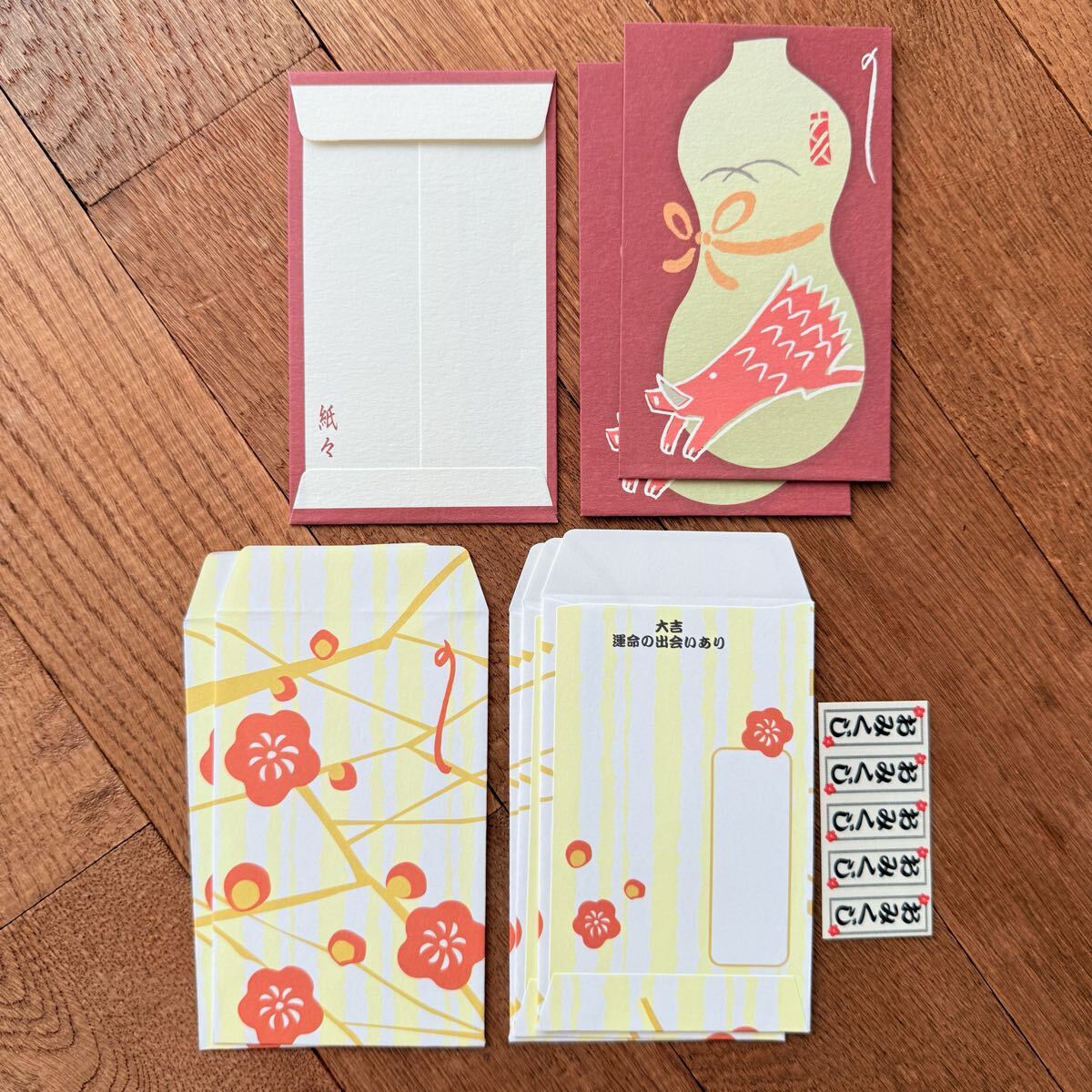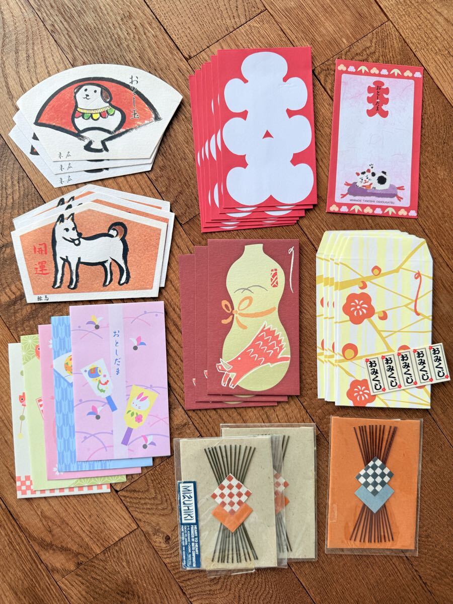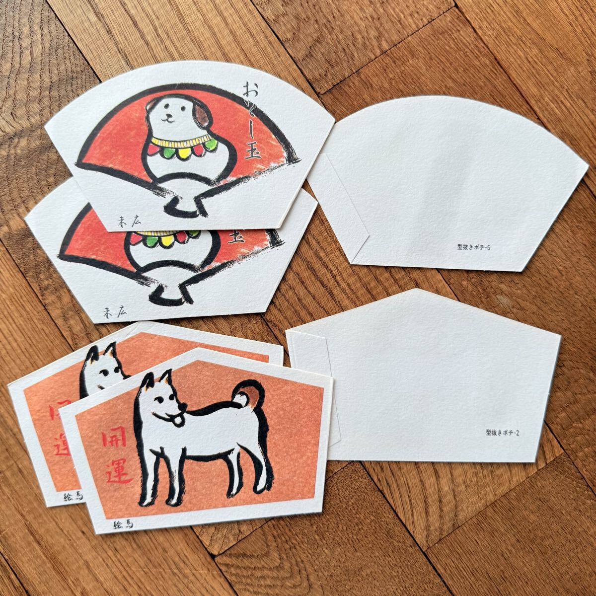 内容は、犬・だるま・ひょうたん・おみくじ・水引モチーフなど、縁起物を中心とした和紙デザイン。