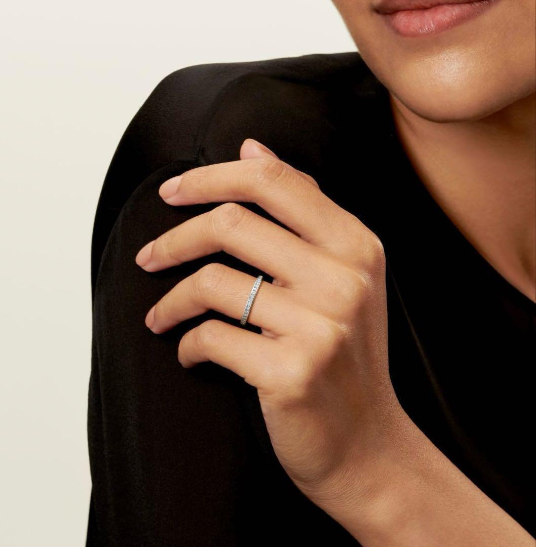 ラウンド・ブリリアントカットのダイヤモンドがびっしりとチャネルセッティングされた贅沢なデザイン。爪留めなくダイヤが隣りあってセットされ、ダイヤの美しいラインが輝かしくきらめきます。