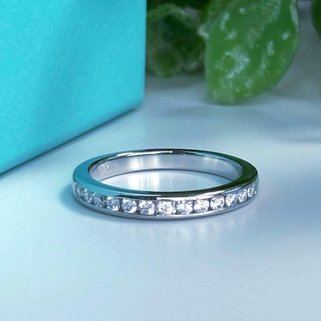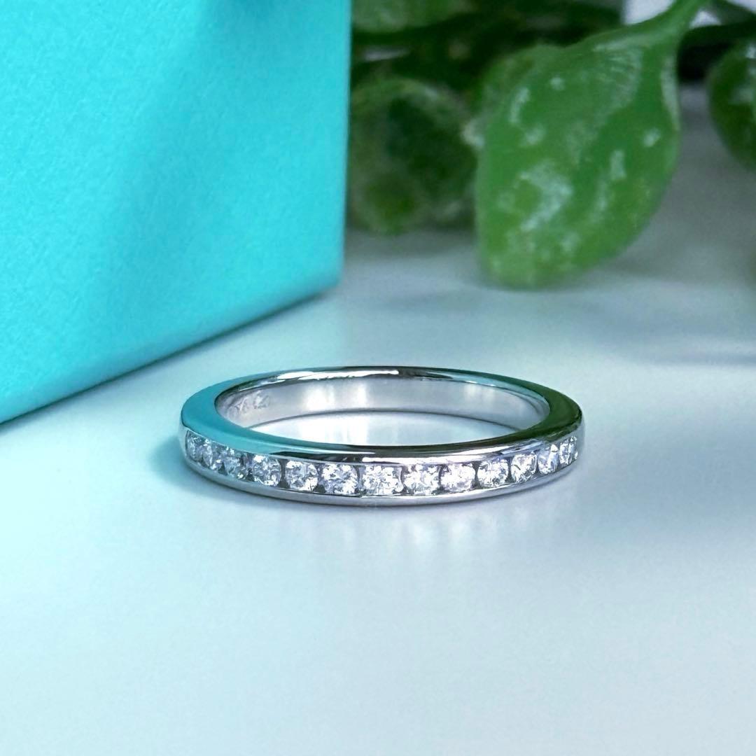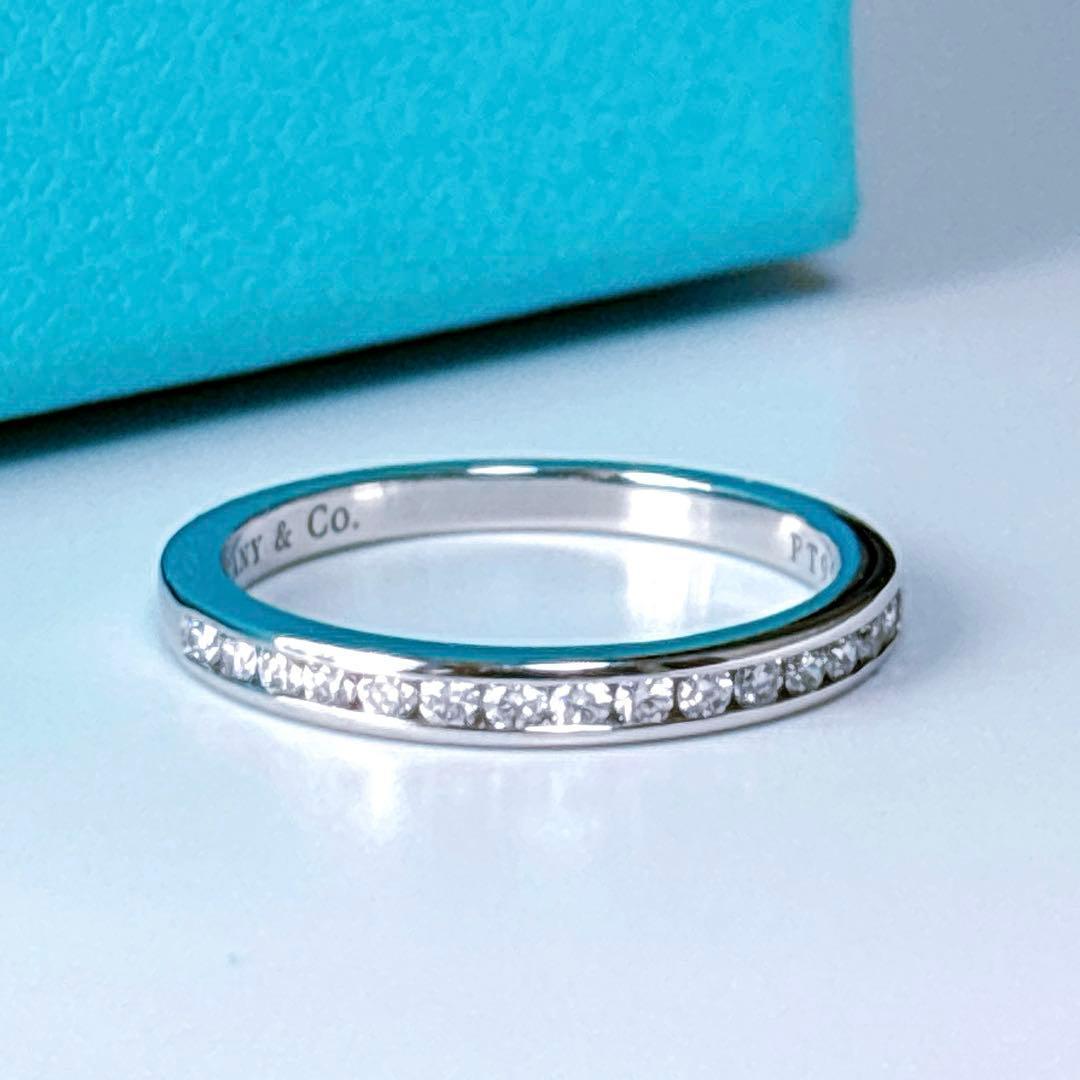 プラチナ台に、ダイヤモンドがセットされたハーフエタニティリング。 タイムレスなデザインで人気のモデルです。