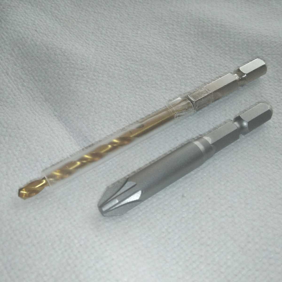 このドリル刃と、ビンディング取付の必須アイテム、ポジドライブの3番ビットをお付けします。