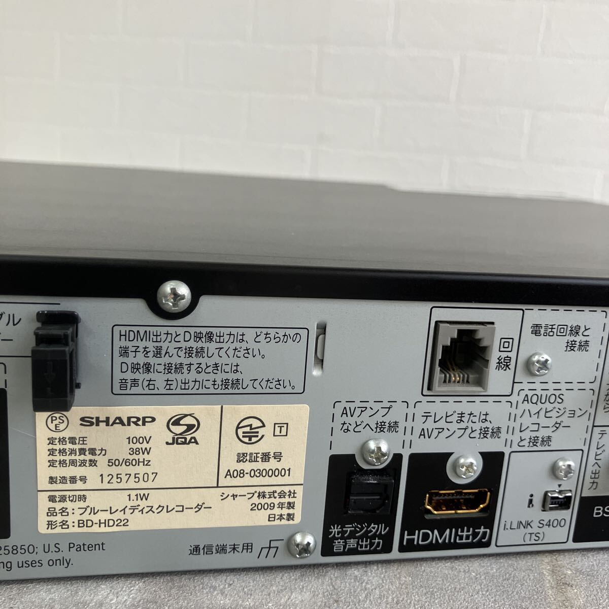 中古 ブルーレイディスクレコーダー SHARP シャープ BD-HD22 AQUOS アクオス 2009年製 日本製 B-CASカード・リモコン付属 通電確認のみ