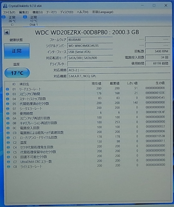 出品前にパソコンに接続し、CrystalDiskInfoでHDDが「正常」判定を確認した後、初期化してあります。