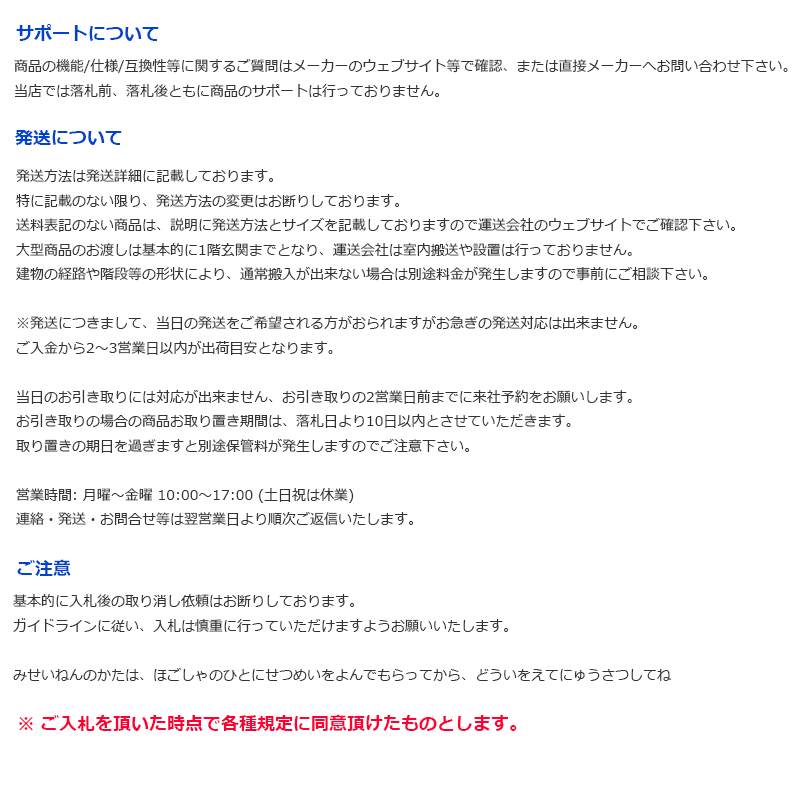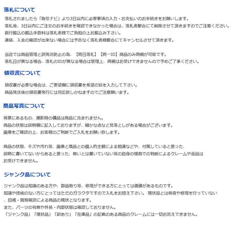 | 注意事項 | ■注意事項 ↓↓入札の前に必ずストア情報もお読みください↓↓ https://auctions.yahoo.co.jp/html/profile/waynami.html 入札前にお読みください 1 入札前にお読みください 2 落札されましたら「取引ナビ」より 3日以内に必要事項の入力・お支払いのお手続をお願いします。 連絡、入金の確認が出来ない場合には落札者様都合にてキャンセルさせて頂きます。 営業時間:月曜~金曜 10:00~17:00 (土日祝は休業) 連絡・発送・お問合せ等は翌営業日より順次ご返信いたします。 ※ご入札を頂いた時点で各種規定に同意頂けたものとします。 |