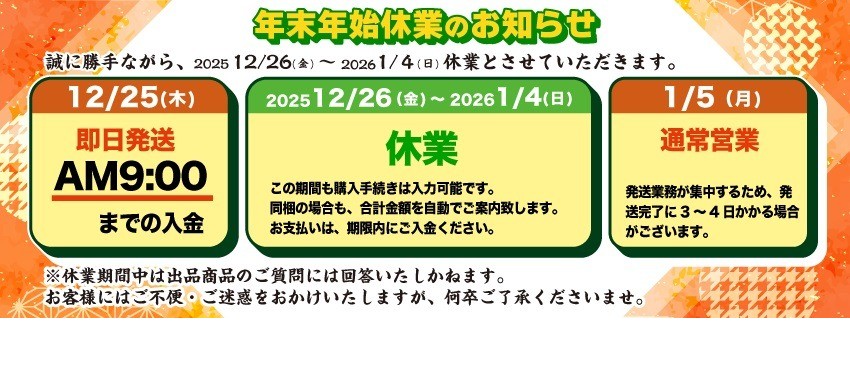 ■ご落札後の日時指定や配送先の変更に関して ご落札後、お荷物の日時指定や宛名の変更等をされる場合は必ず、一番最初のご連絡時に、一緒にご指定ください。その後のご連絡の投稿では、すぐに確認出来ない場合や、気づいても間に合わない場合がありますので、一番最初にお客様の発送先をお知らせ頂く際に日時指定や宛名の変更等のご指定ない場合は、対応が間に合わないものとお考えください。 当店では商品の取り扱い量が多く、システム化により、きめ細かな対応が出来ない場合がありますので、どうかご協力をお願い致します。 ■ご落札後の質問でキャンセルが増えております。 常時監視はしておりませんので、ご質問がございましたら、遅くともオークション終了日の前日までにお願い出来ればと思います。 尚、土日祝日はお休みを頂いておりますので、土日祝日の回答が出来ません。その点もご考慮頂いた上でご協力頂ければ幸いです。 【評価について】 発送連絡後、評価を送信いたします。 「評価なし」をご希望の方は、お支払いの完了よりも前に 取引メッセージより「評価なし」の旨ご連絡をお願いいたします。 ■キャンセルについて 当店に瑕疵のない場合や、お客様都合による、ご落札後のキャンセルに関しましては、 同商品の再出品の際に、吊り上げ行為などと間違われるお問い合わせが多いため、 ご落札者様には「非常に悪い」の評価がついてしまい誠に恐縮ですが、 落札手数料のご負担を頂いての【次点繰り上げを行わないでほしい】【落札者削除をしないでほしい】等のお申し出はお断りさせて頂いております。 この場合、公平を期すため【次点繰り上げ】や【落札者削除】等の処理をさせて頂き、 他のお客様に適正な処置をした事を周知させて頂きます事を予めご了承ください。 当店とお客様との信頼を損なわぬための処置ですのでご協力ください。 ■キャンセルでの再出品の場合は、別途、その旨、明記します。 | |