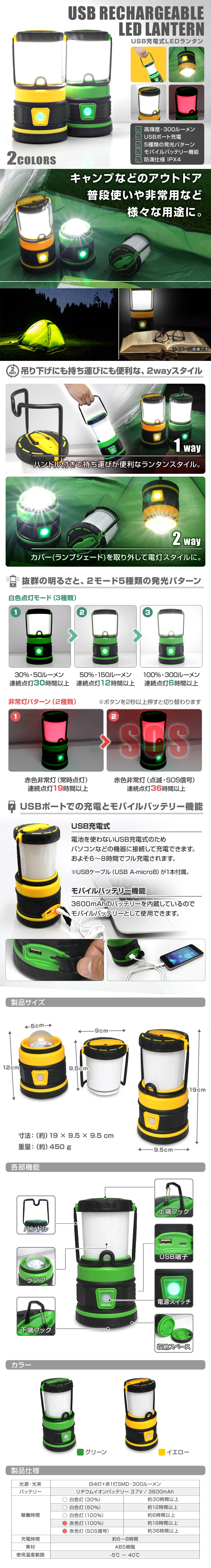 手持ちや置いたり、逆さにつるしても使えるコンパクトなLEDランタン! 高輝度のLED電球を採用! ハイモードの場合では300ルーメンで、キャンプや停電中、周囲を十分に照らす明るさを確保できます。 夜道を歩くときなど懐中電灯のように手で持ったり、テーブルの上に置いたり、ラップシェードを取り外して吊るして使うことも♪ 点灯モードは昼光色の点灯「ハイ」「ミドル」「ロー」と非常灯(赤色灯)の「点灯」と「点滅」の5パターン。 3600mAhのバッテリー内蔵で、iPhoneなどスマホの充電も可能!
