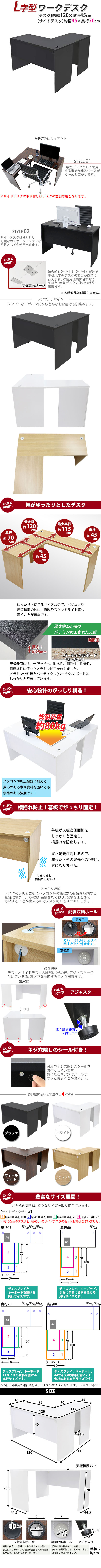 | 商品紹介 | ■作業スペースを広く確保出来る、L字型ワークデスクです。 ■サイドデスクの幅が約45cmのタイプです。 ■会議室や事務所等、オフィス家具として様々なシーンでお使いいただけます。 ■天板には、メラミン加工を施しています。 ■幕板が天板と側面板をがっちりと固定!横揺れを防止します。 ■ネジ穴隠しのシール付き。(サイドデスクのみ付属) ■デスクの天板と幕板に配線収納ホールが2カ所ずつ備わっています。 ■アジャスターで高さの調節が可能です。(高さ調節範囲〜約15mm) ※こちらの商品は、組立て式です。組立てにはプラスドライバーが必要です。お客様でご用意ください。 ※組立図が付属します。 ※サイドデスクの取り付けはデスクの左側専用となります。 ■材質:パーティクル(パーチクル)ボード(メラミン加工)(本体、サイドデスク)、プラスチック(アジャスター、配線収納ホール) ■重量:約36kg(デスク:約23kg、サイドデスク:約13kg) ■総耐荷重:約80kg ●新品商品ではありますが、輸入商品の為、多少の擦り傷などがある場合がございますので、ご納得の上ご購入下さいませ。 ●ご購入後、お客様ご都合によるご返品、ご返金等は一切お受け致しておりません。 ●本商品を使用した際に発生したトラブル、事故につきまして、当社は一切の責任を負いません。ご使用に関しましては、全て自己責任にてお願い致します。 ※カラーはブラックとなります。 |