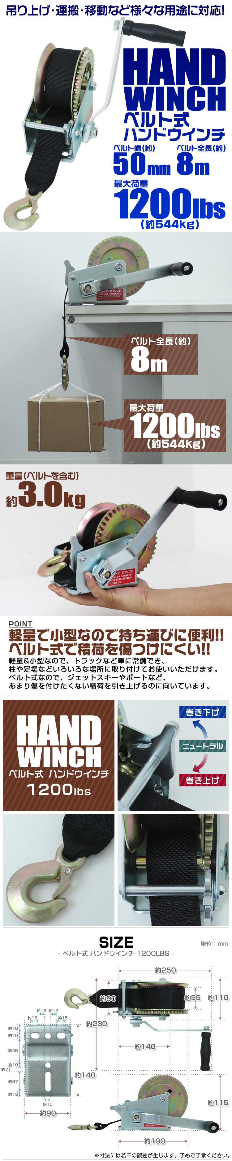 ベルトタイプのハンドウィンチです。 軽い力で作用し、能率的な荷締めが可能です。 重量物の昇降または牽引作業に。 【商品仕様】 本体寸法 :寸法図をご確認ください。 ベルト:径約5cm、全長約8m 最大荷重:1200LBS(約544kg) 本体重量:約3kg 保証期間 :7日間 ※商品到着後7日以内の初期不良・破損のみご対応させていただきます。 【注意事項】 ・商品は、モニターによって色合いが異なって見える場合があります。 ・仕様・デザインは改良のため予告なく変更することがあります。 |