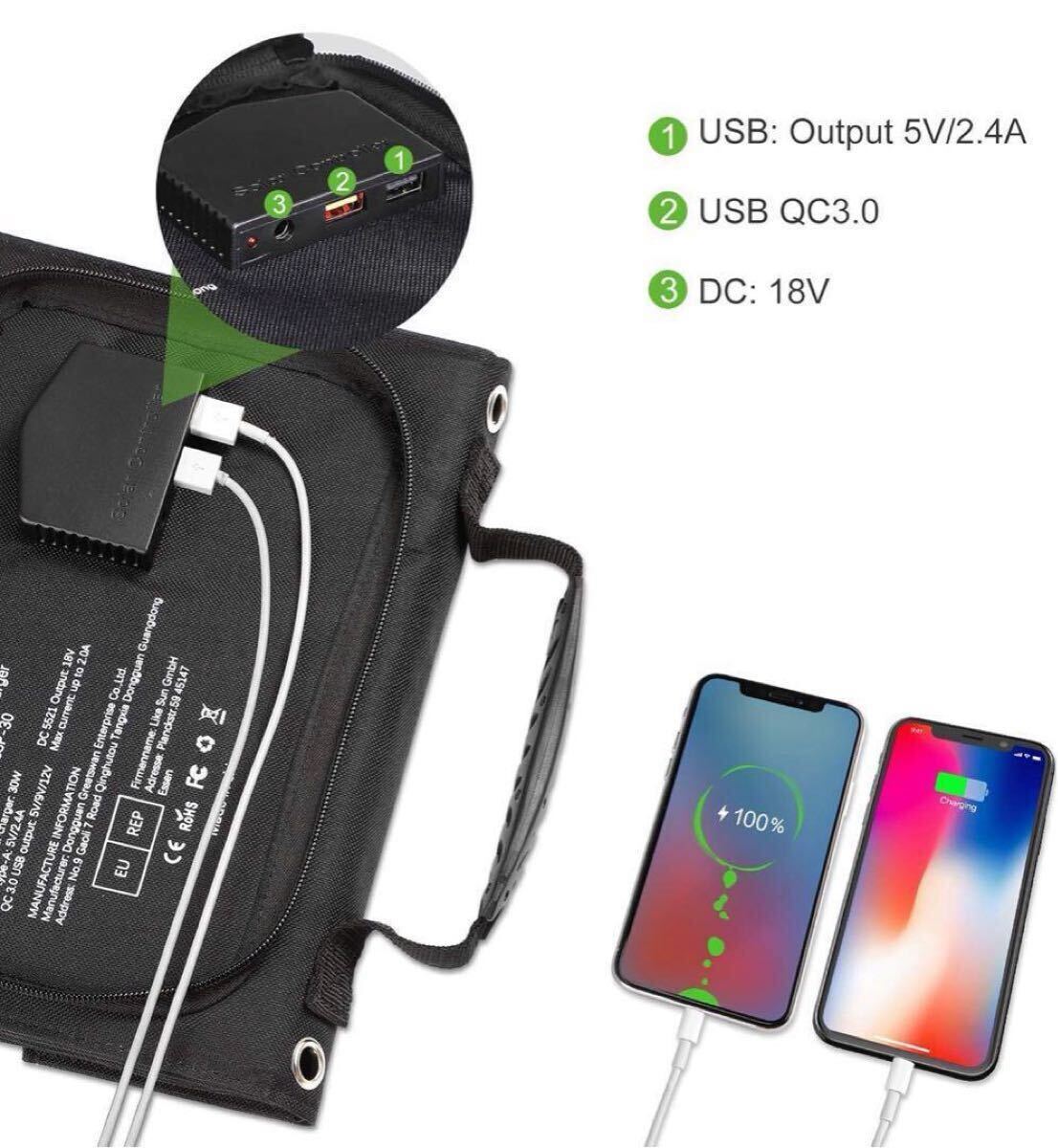 この30Wの折りたたみ式ソーラーパネルは、あらゆる気象条件に耐える耐水性があり、キャンプ、登山、ハイキング、ピクニックなどのアウトドアアクティビティに最適です。 注意:ジャンクションボックスは防水ではありませんので、乾いた状態に保ってください。 IPX4防水レベルで、時折の雨や湿った霧からソーラーパネルを保護します。