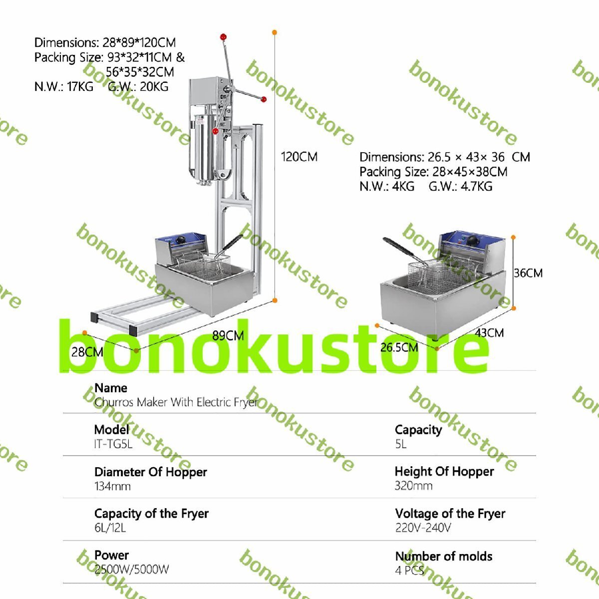関数1.ステンレスボディ。ステンレス製のボディは美しい外観で、食品プロセスを清潔で健康的にします。2. 4 つのフォーム。 4つの型でさまざまな種類のドーナツを作ることができます。フルーツジャムを詰めることができます。3.人間化されたデザイン。じょうごは移動できるので、生地に簡単にアクセスできます。4. 新しいパワフルなトランスミッション。新動力伝達、押し戻し2段変速。5. 押し出し生地の設計。押出生地設計、非常に省力化。6.便利で時間を節約できます。モデルの説明: IT-TG5L容量:5Lファンネルの直径: 134 mmファンネルの高さ:320mmフライヤー容量:6Lフライヤー電圧:220V電力:2500W包装内容明細書:1 * 5L 垂直スペイン チュロス メーカー