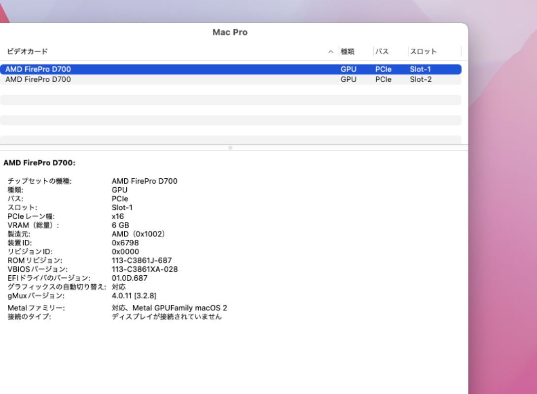 | ディスプレイ: グラフィックス AMD FirePro D700 (x2) 搭載、大容量 6G専用ビデオメモリーvRAM 快適使用体験! |