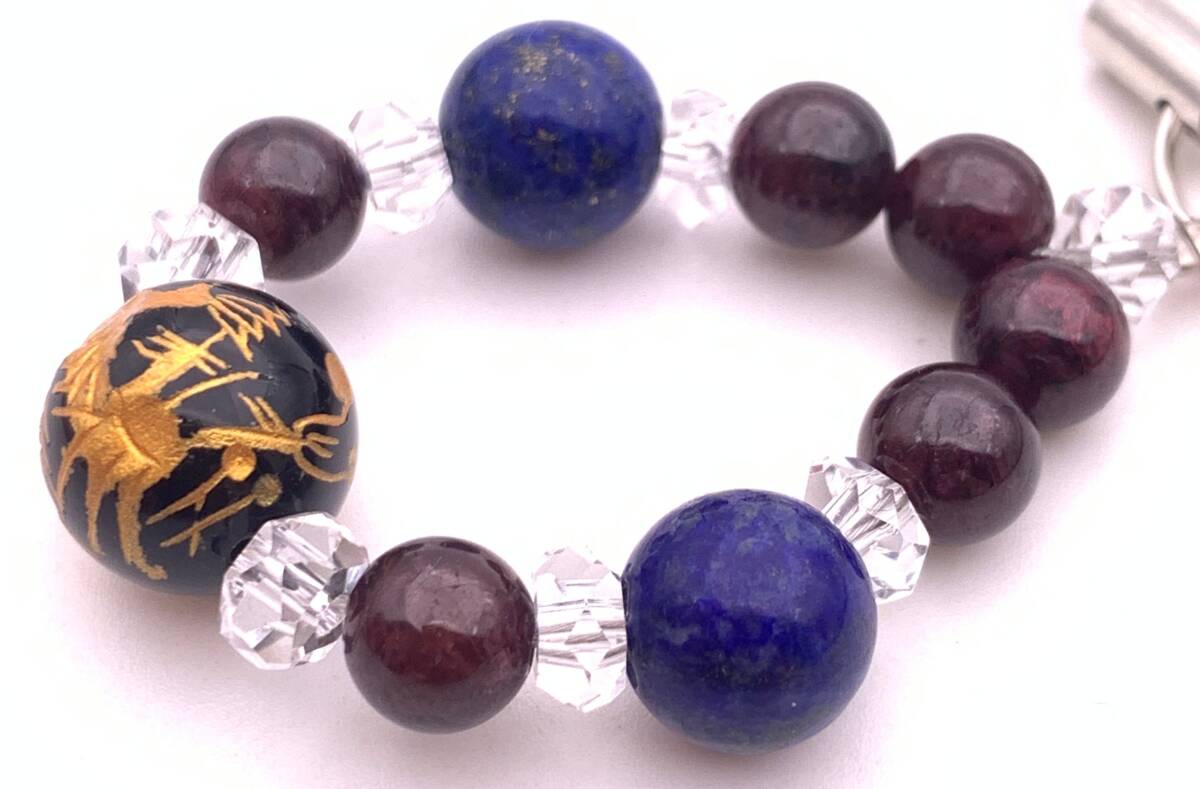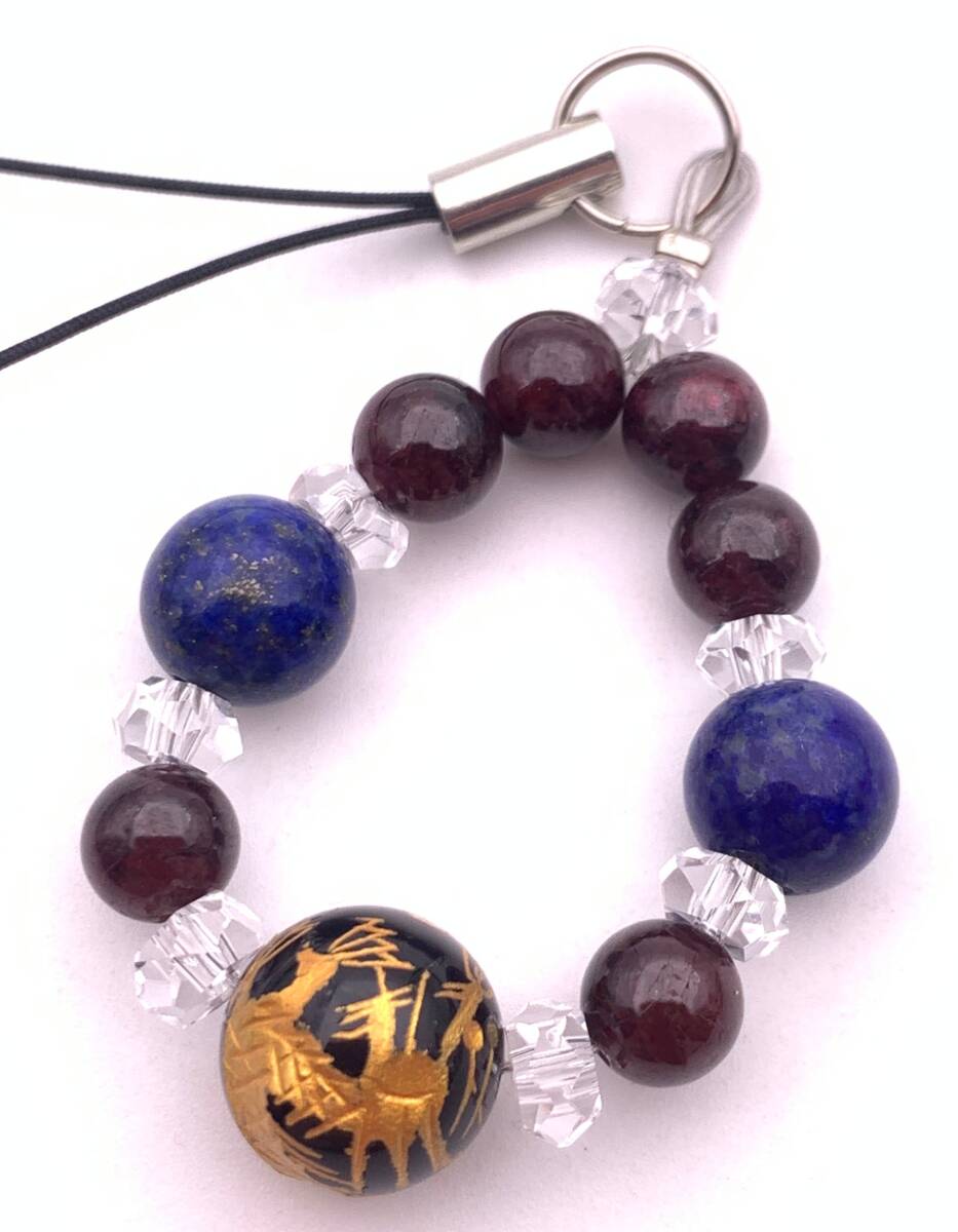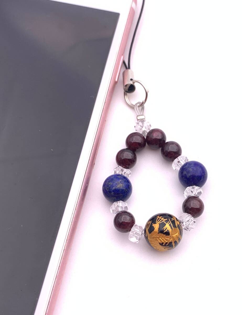 天然石オニキス金彫り青龍&ガーネット&ラピスラズリのストラップ