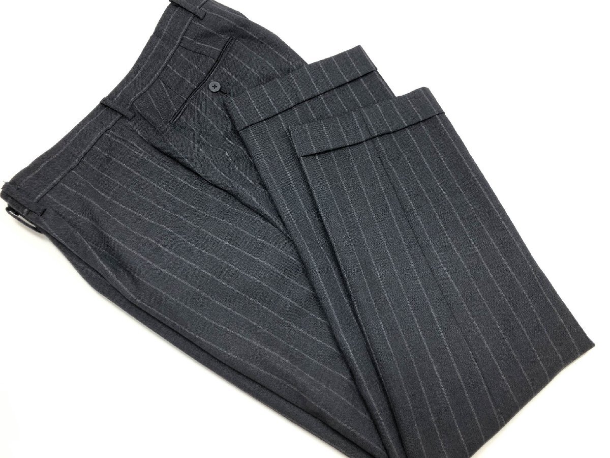 ・スラックス・・・ウエスト実寸約82センチ(4センチ出し、4センチ詰め可能)、股上約24センチ、渡り幅約32センチ、股下約71センチ、総丈約94センチ、裾幅約19センチ、ダブル仕上げ(ダブル幅約4センチ、最大でプラス9センチ長くできます)