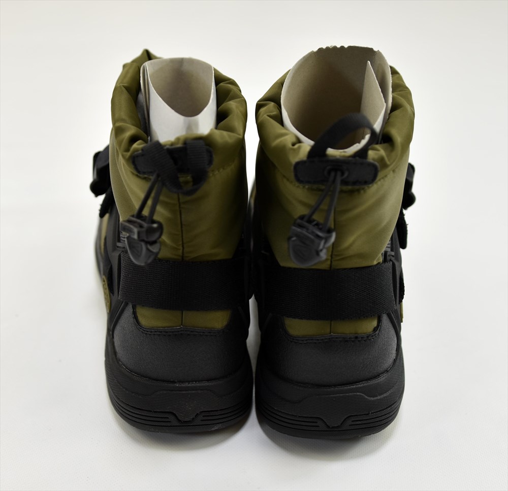 ・履き口にはドローコードがあり、フィット感の調整が可能です。こちらはオリーブを使ったミリタリーテイストに仕上げています。
