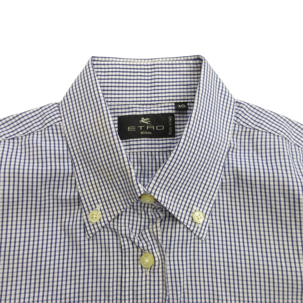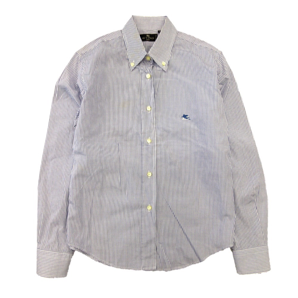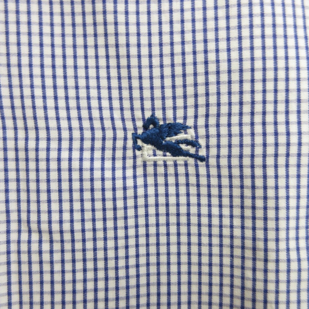 ETRO エトロ ギンガムチェック ボタンダウン シャツ ブラウス カットソー ロゴ 刺繍 40 青 ブルー 白 ホワイト