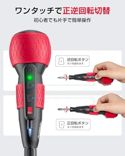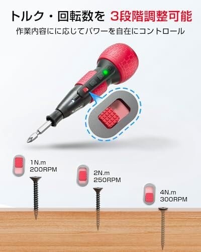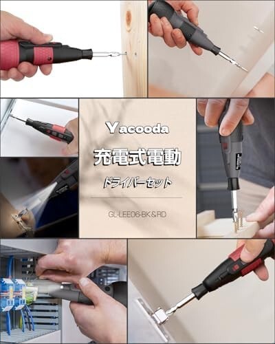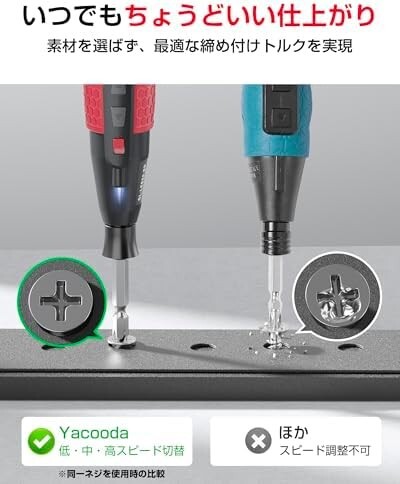 • 【新機能・トルク3段階調整】Yacooda 電動ドライバーは1つのボディで2つの回転・トルク3段階調整可能のモードを搭載!赤いボタンを押すだけで【低】、【中】、【高】のトルクに切り替えます。