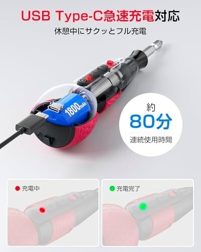 • 【80分連続使用・250本以上のネジ締め】従来の900mAh容量電池と比べて、Yacooda電動ドライバーはバッテリー容量が2倍以上!3.6V・1800mAhの超大容量バッテリーを内蔵しており、約100分でフル充電が完了し、その後約80分連続使用可能(無負荷状態)です。