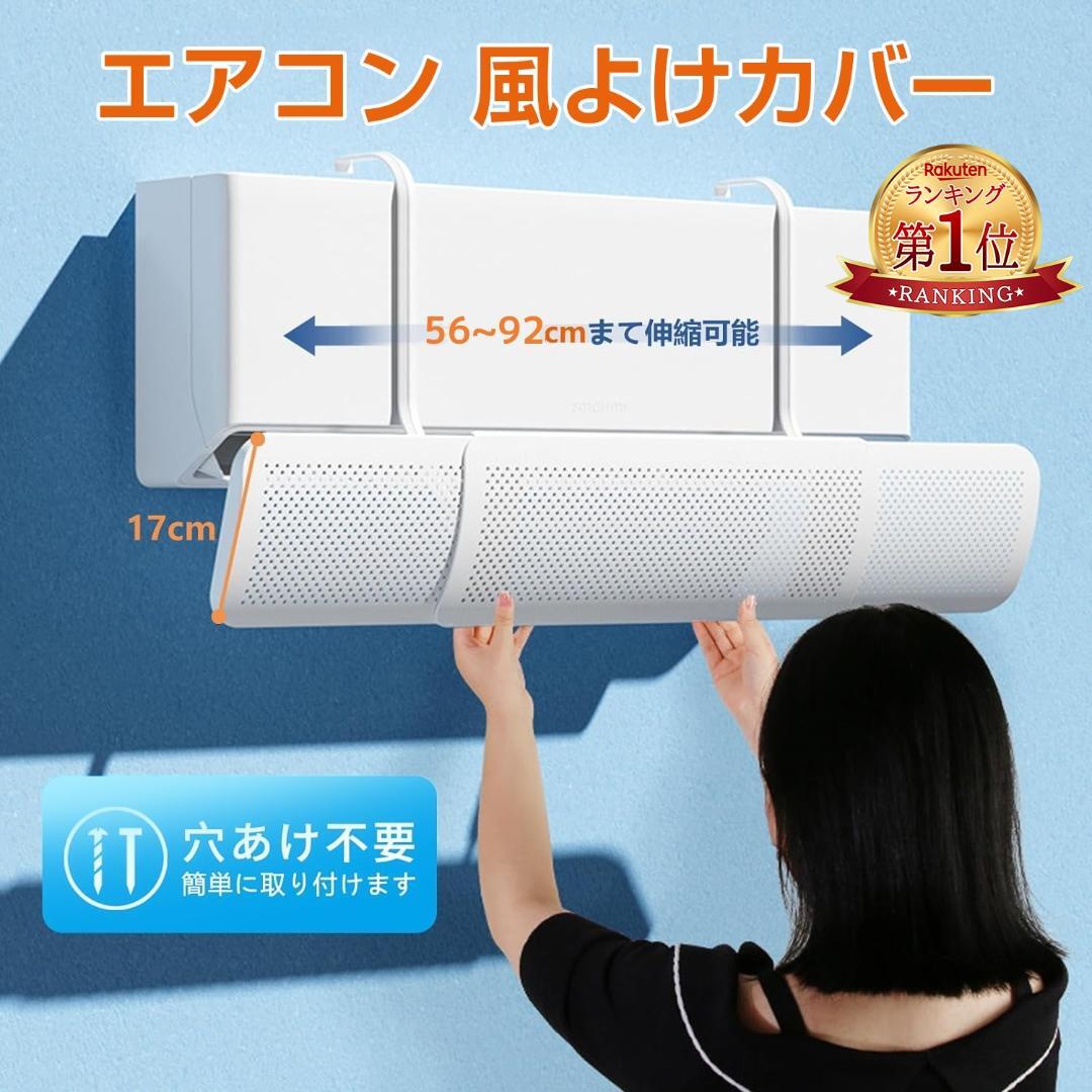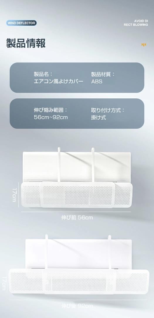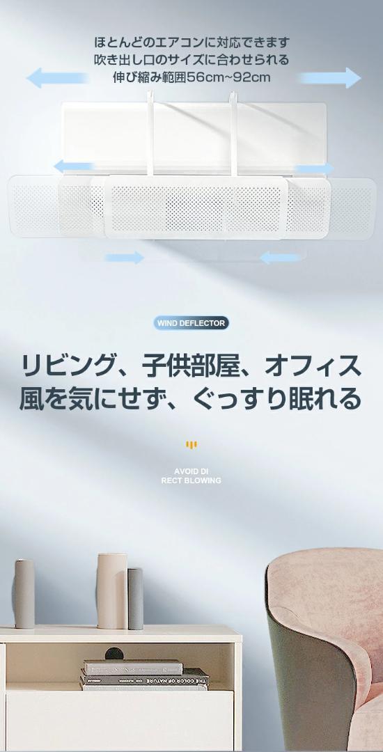 | 幅広いエアコン対応可能 | 伸縮式で最小56m,最大89cmまで伸ばすことができますのでほとんどの家庭用エアコンに取り付けられます。設置すると、風が当り続ける不快感を緩和できます |
