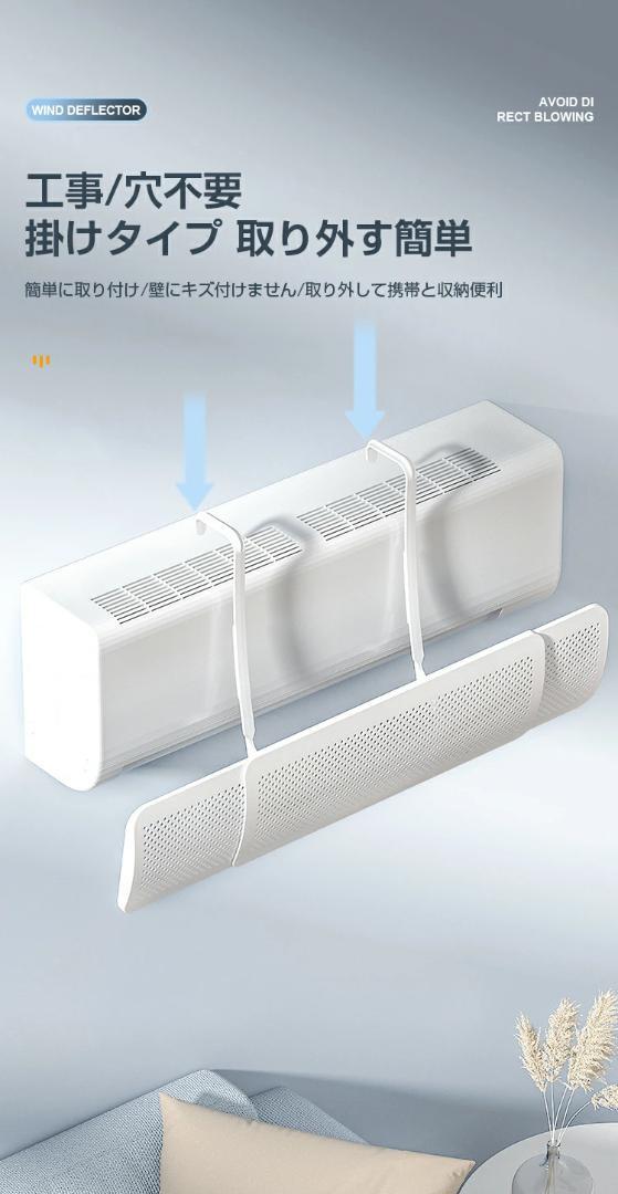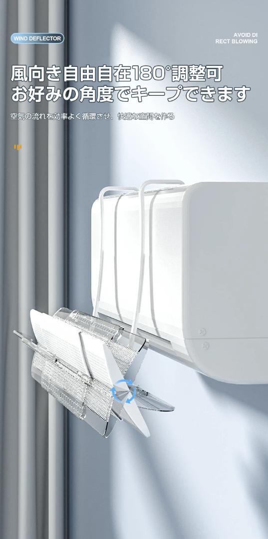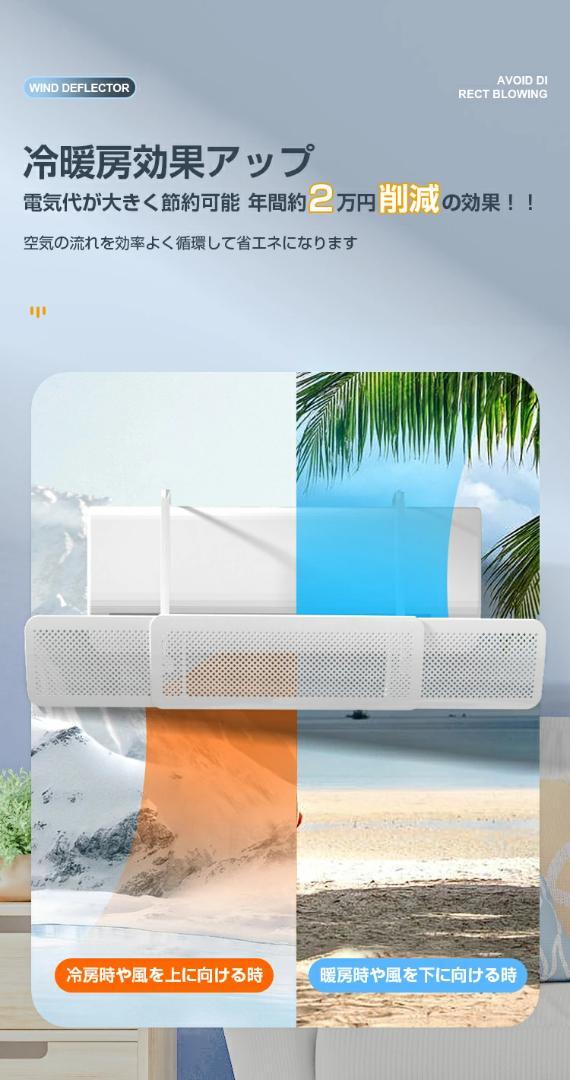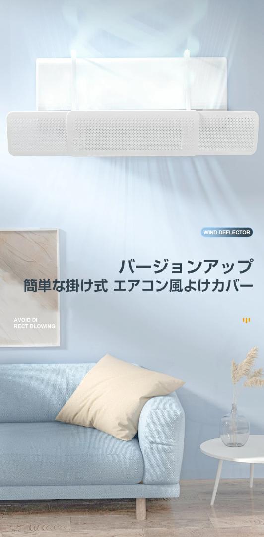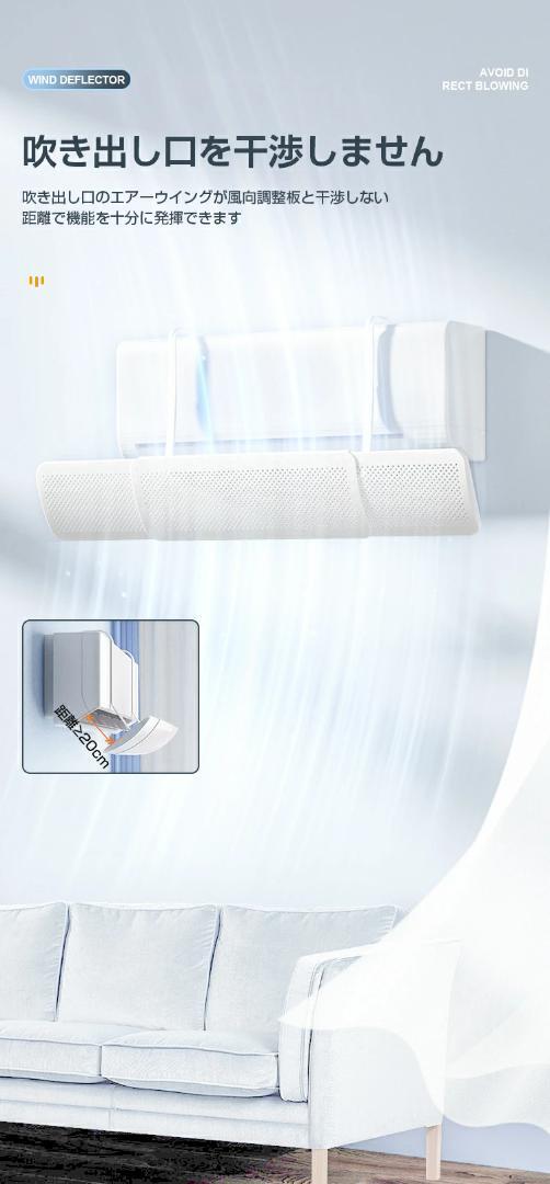 | 直撃風防止 | 風よけカバーを取付、シンプルな構造で、装着後は風が正面に直接あたらないので、とても快適です。エアコンの直撃風を解消し、快適な風をお部屋の隅々まで循環させます。 |