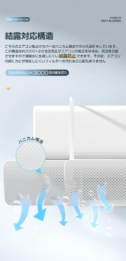 | 結露防止!!! | 約3000+小さな空気孔がエアコンの風圧をゆるめ、気流を分散させますので凝縮水に生成しにくい結露防止できます。だから、エアコン内部にカビが発生しくい、フィルターの汚れなども心配がありません。 |