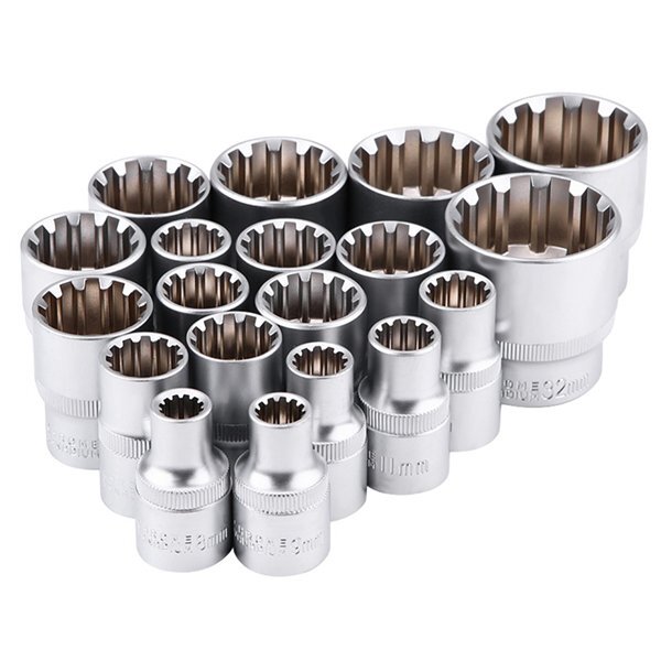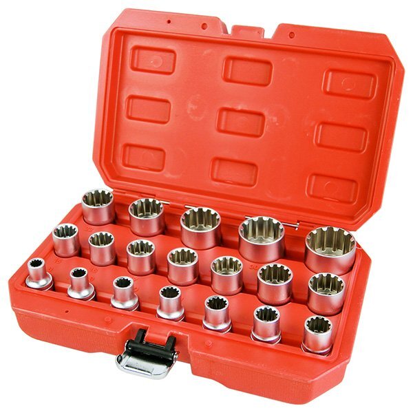 | 商品詳細 | スプラインソケットとはヘックス、トルクス、4角、6角、12角、インチサイズ合計8種類に対応することができる万能ソケットです。 6ポイントでも12ポイントでもない、12本の筋が立ったスプライン形状は一般的な6角ボルトや一部の外国車で使われる12角、ヘクスローブボルトや四角ボルトにも使えて、さらにボルトの角部と接触しないためナメたボルトも回すことができる。 形状は独特だがボルトへのフィット感は良く、面接触でトルクをしっかり伝達できる。 ガレージに1セットを常備すべきのソケットせとです、お勧めです。 このせっとがあれば、インチ&ミリサイズのソケット別々で買い揃えることは必要なくなります。 ハーレーなど外車をいじる方の必需品です。 ■商品仕様 ・サイズ: 8、9、10、11、12、13、14、15、16、17、18、19、.20、21、22、24、27、30、32mm ・差込角: 1/2"(12.7sq.) ・全 長 : 38mm ・材 質 : CR-V ・重 量 : 約1.9kg |