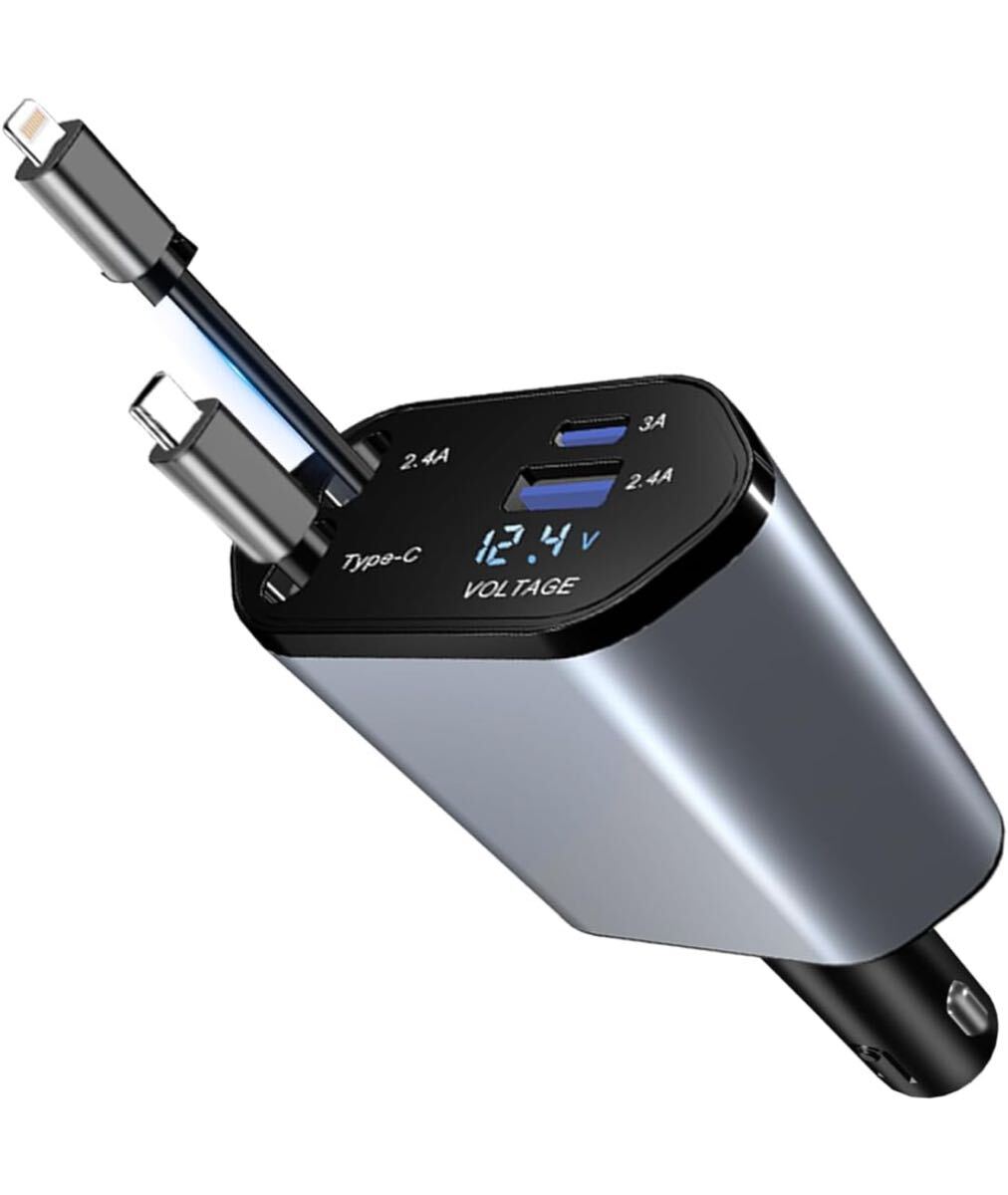 シガーソケット USB 車 充電器 カーチャージャー 巻き取り式 4 in 1 4台同時使用 ケーブル 2本 DC12/24V 車対応 多機種に対応