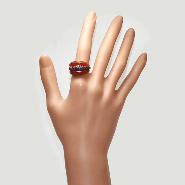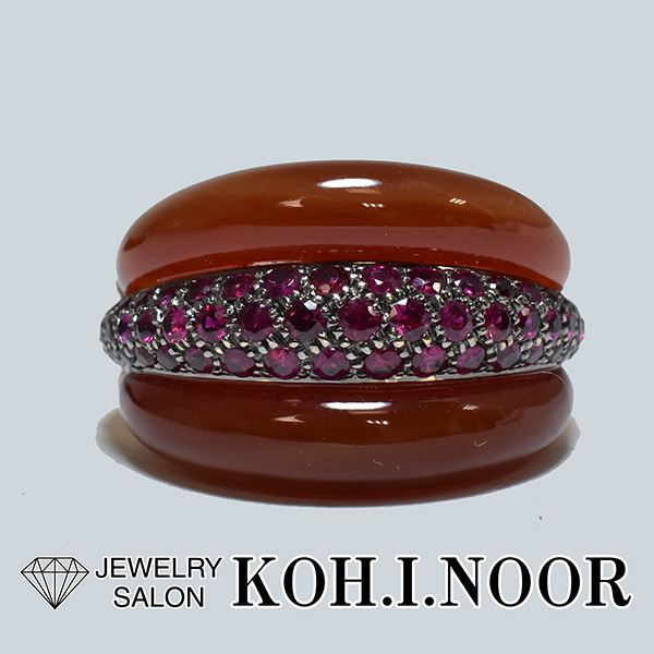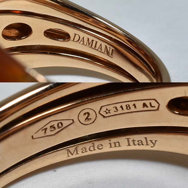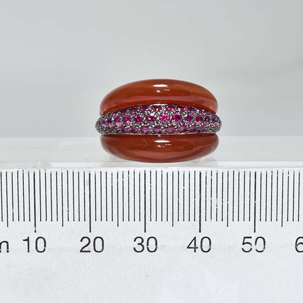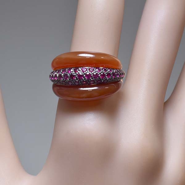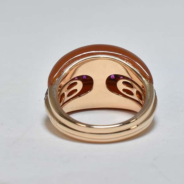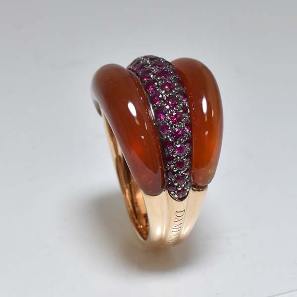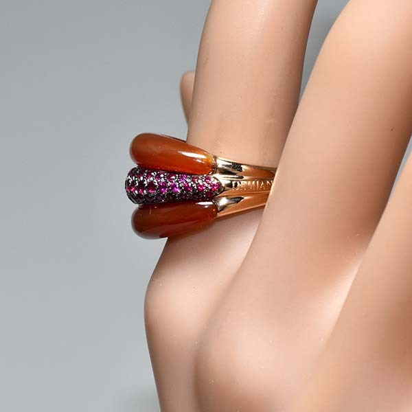 センターラインにルビーをセットしたダミアーニの18金ピンクゴールド製ファッションリング。