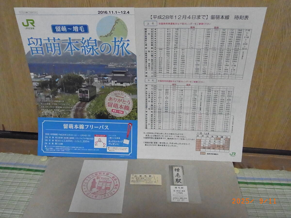 留萌本線 留萌ー増毛間運転最終日入場券、記念スタンプ、チラシ他 ★送料無料★